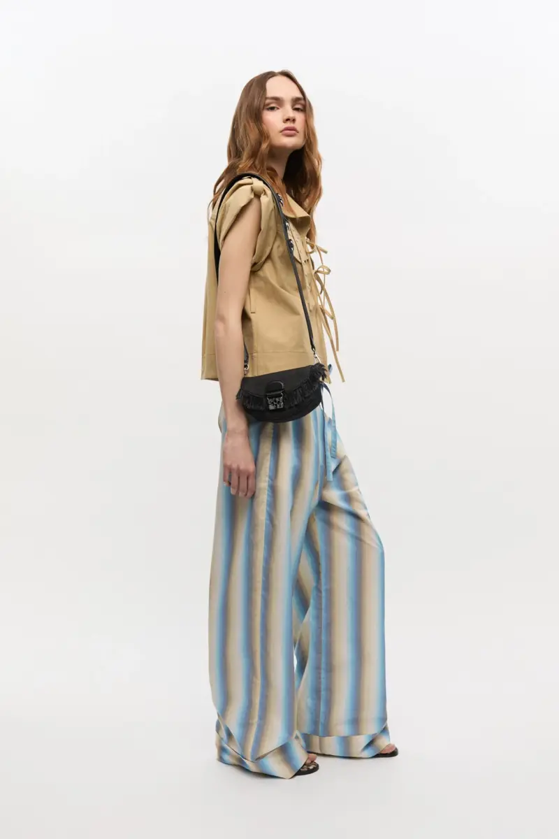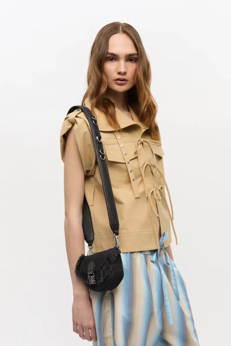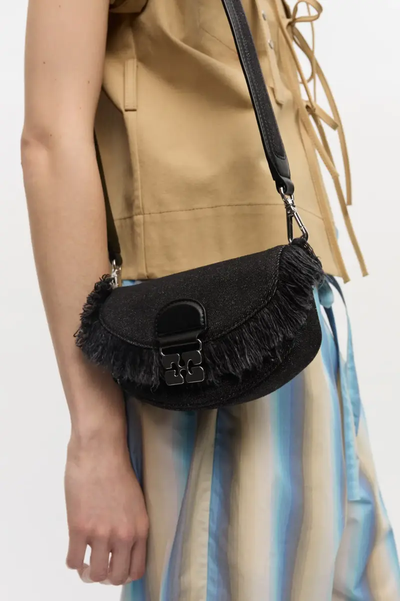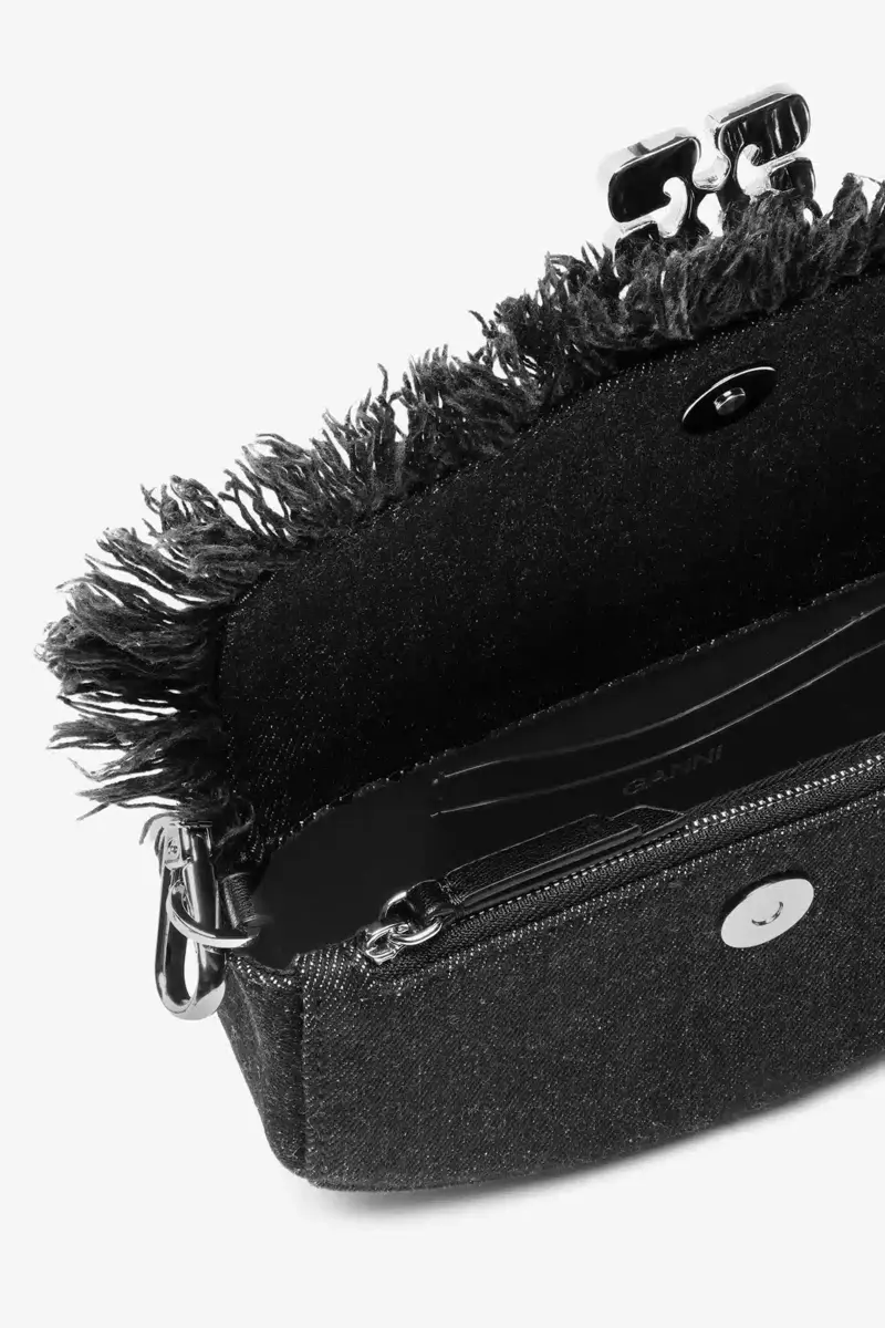 This bag features an adjustable and removable shoulder strap. The bag has a magnetic closure with the signature GANNI Butterfly clasp and 2 main compartments.