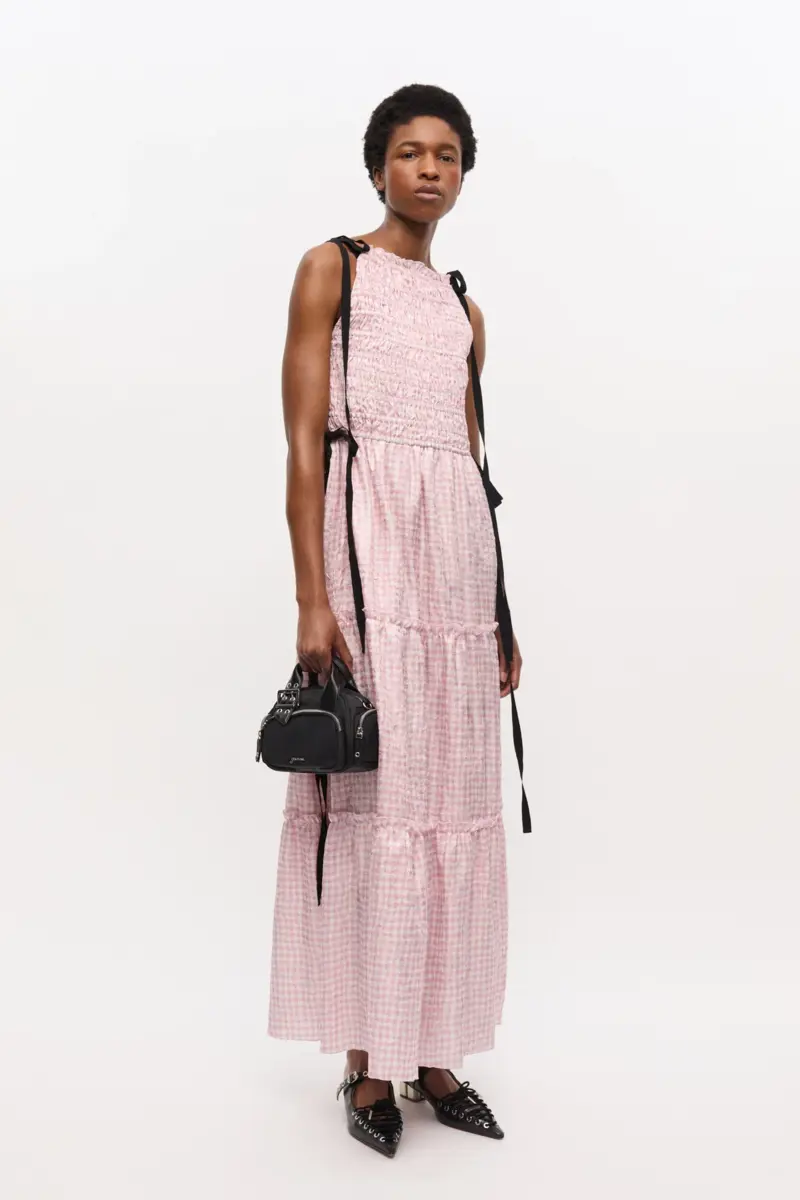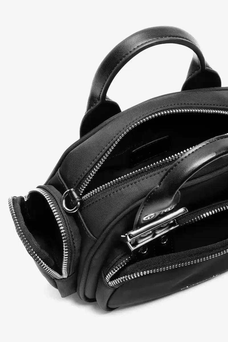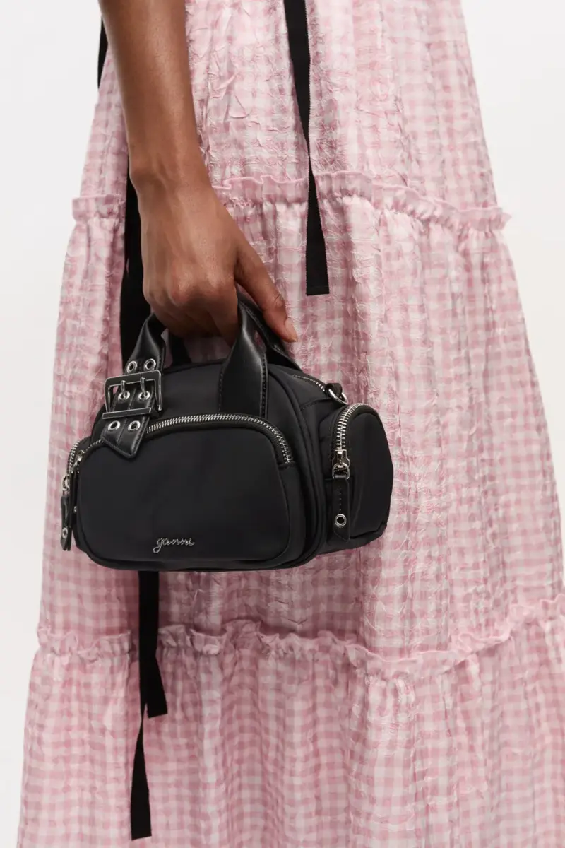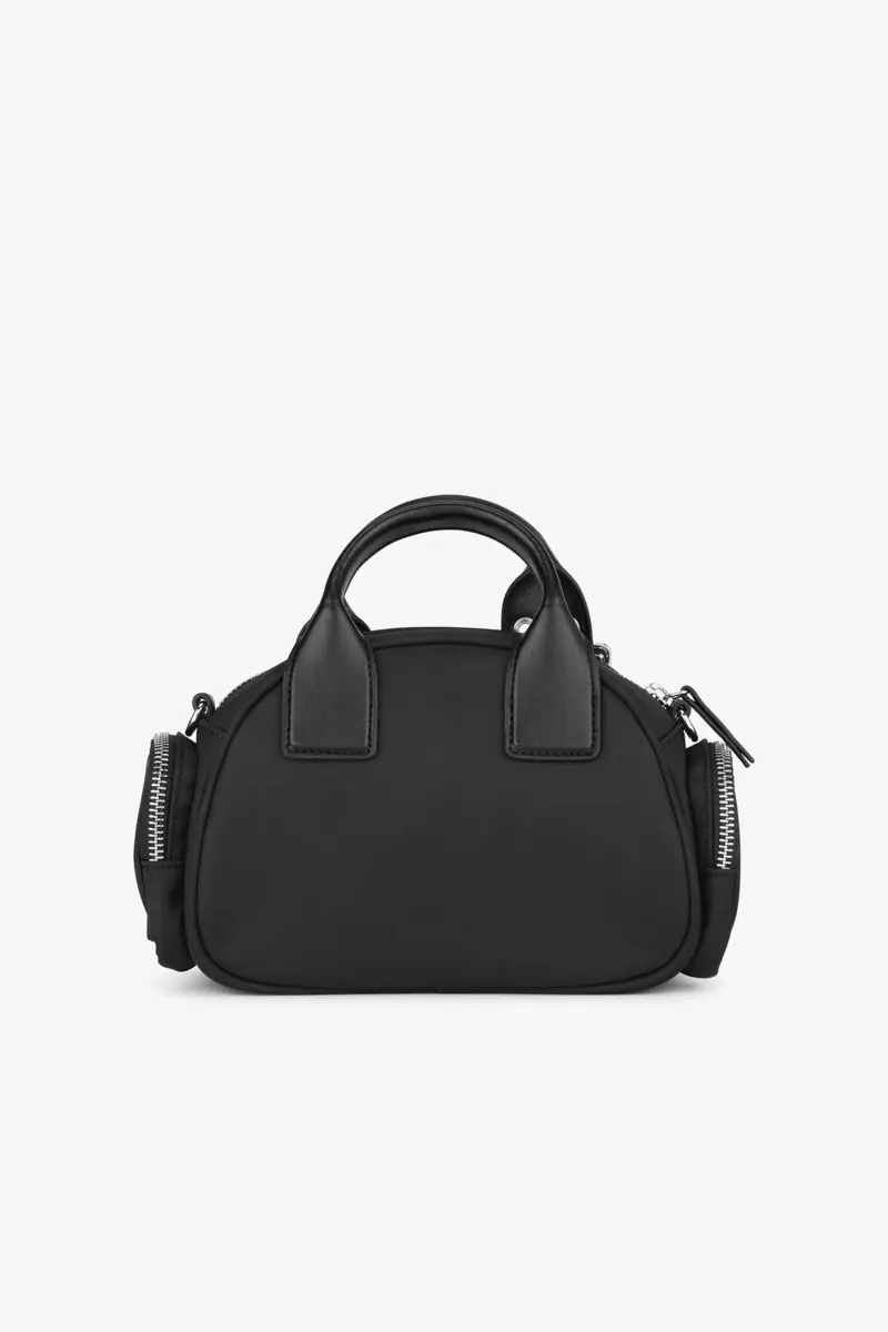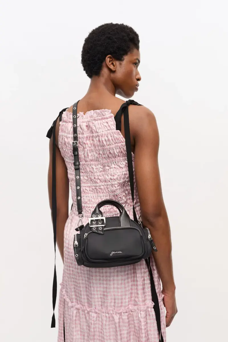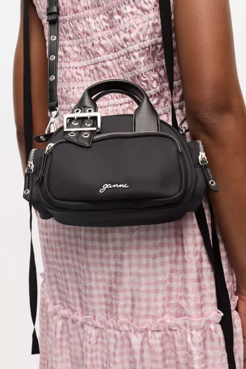 This bag features a top handle and an adjustable shoulder strap with metallic hardware. It has a zip closure, one front pocket, 2 side pockets and a silver-tone GANNI logo.