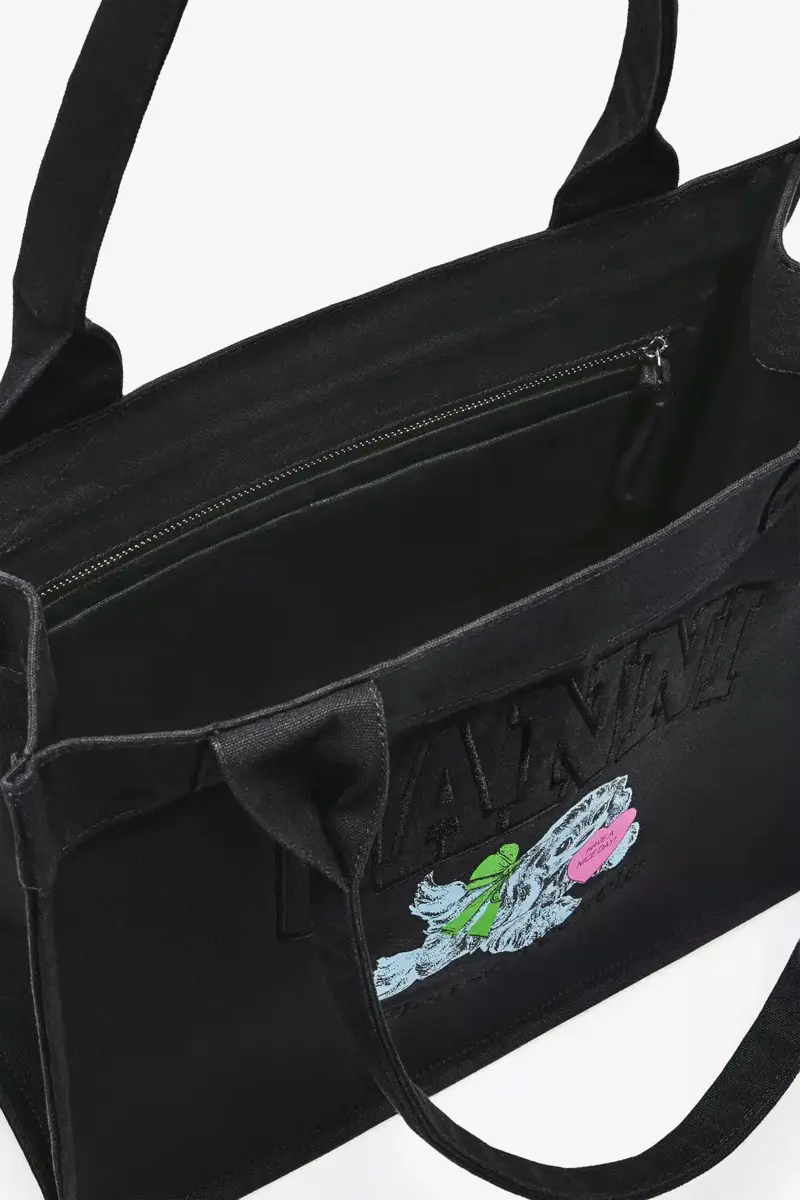 This tote bag features top handles, one large compartment, and a GANNI logo with a puppy print graphic and the phrase ‘Have a nice day! Please recycle’.