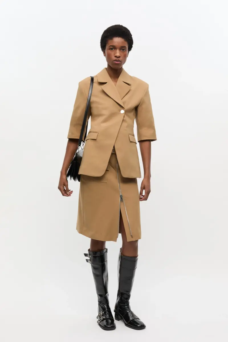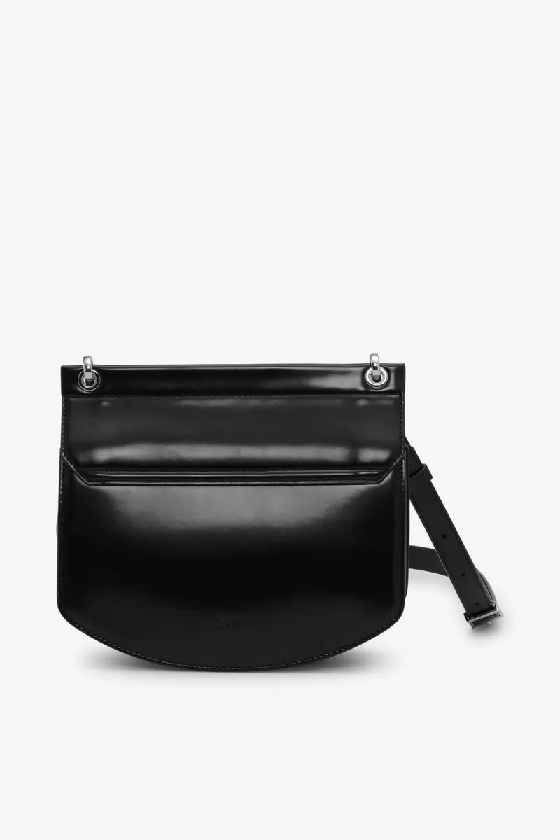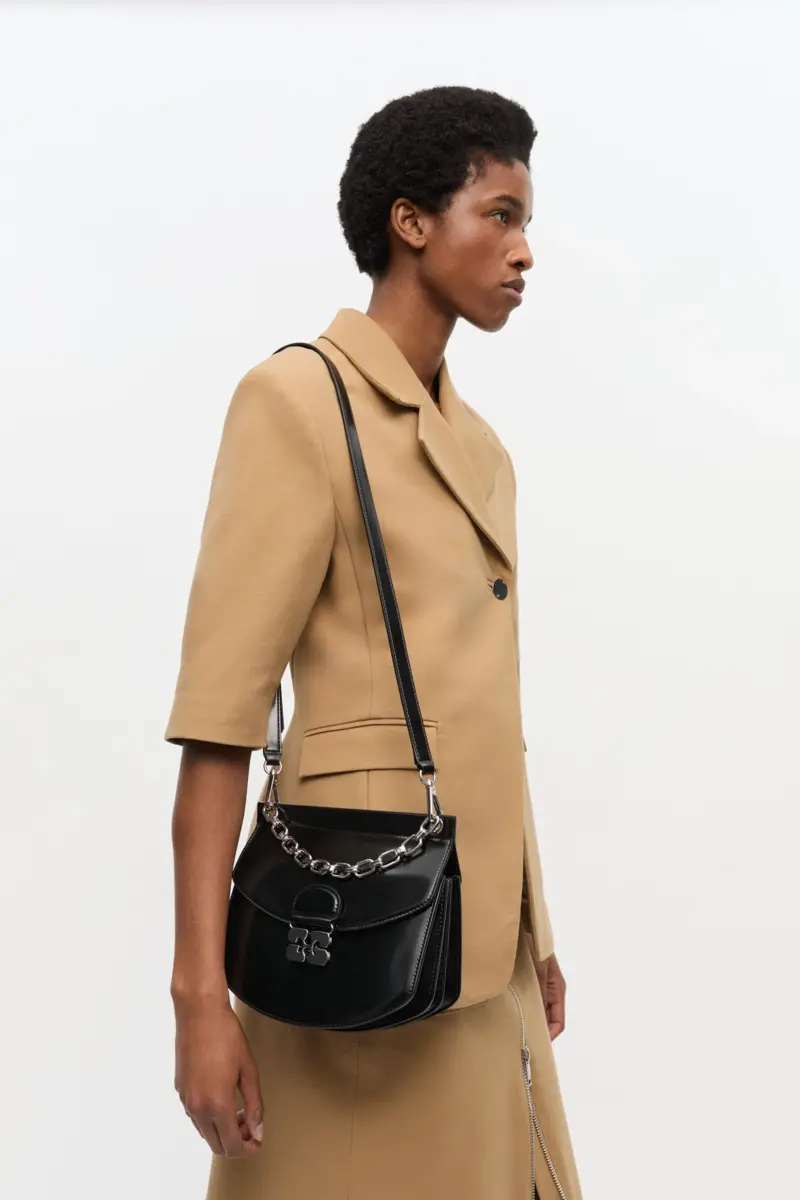 This bag features a structured silhouette, a box chain handle and an adjustable and removable shoulder strap. The bag has a magnetic closure with the signature GANNI Butterfly clasp in
