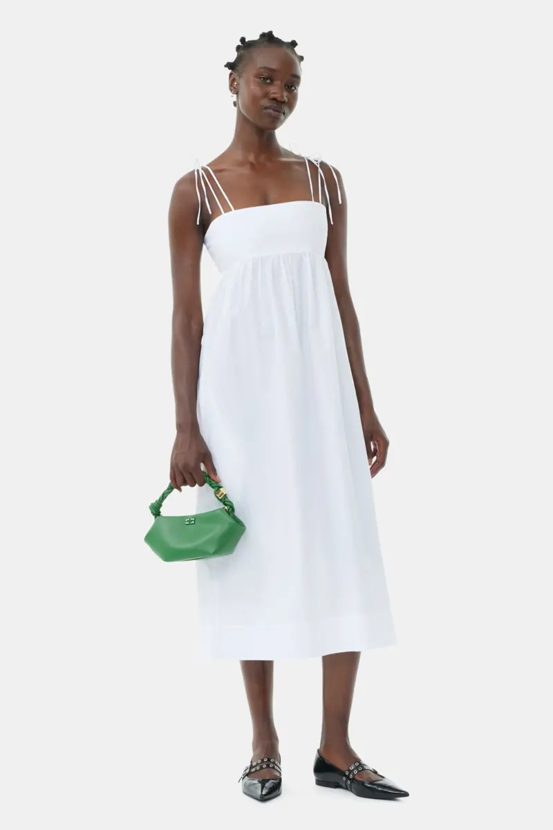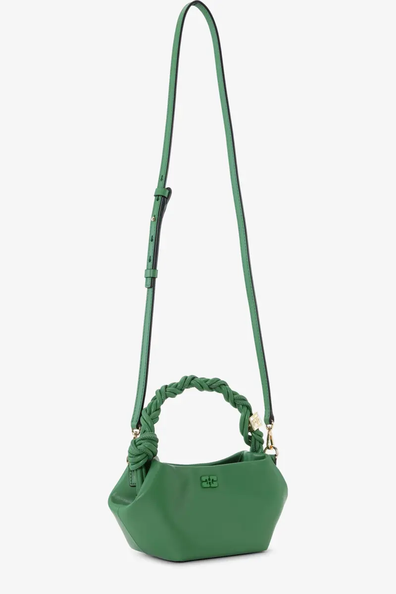 This bag features a tone-on-tone metallic GANNI Butterfly logo, a twisted handle with a braided knot, and a gold-tone metallic dice with a GANNI Butterfly logo engraved. The bag has an