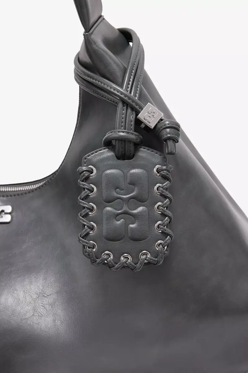 The bag is crafted in recycled leather featuring a mirror hangtag and logo hardware.