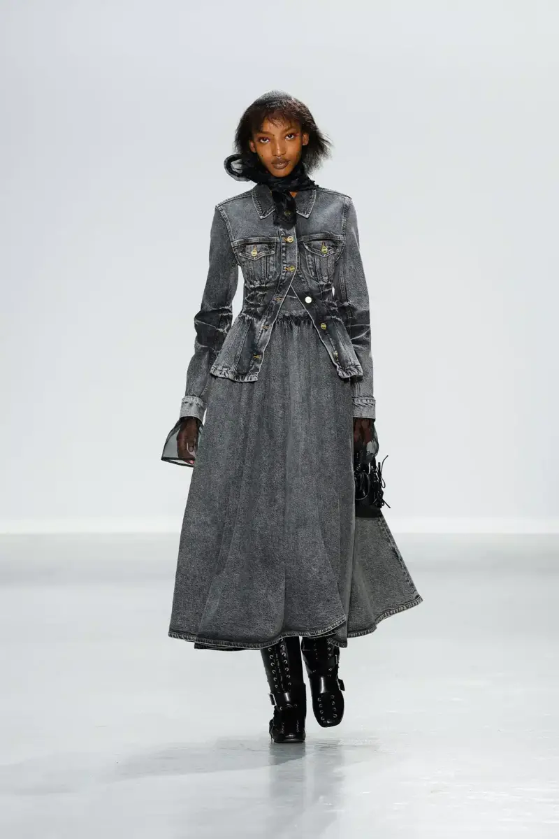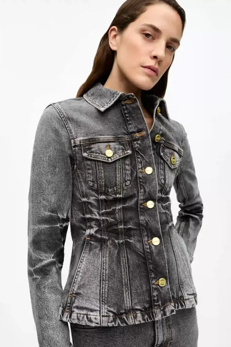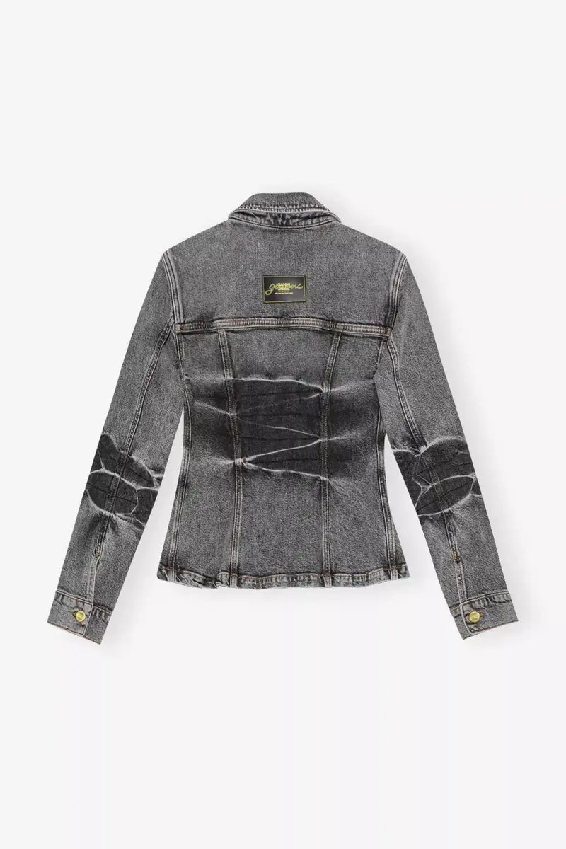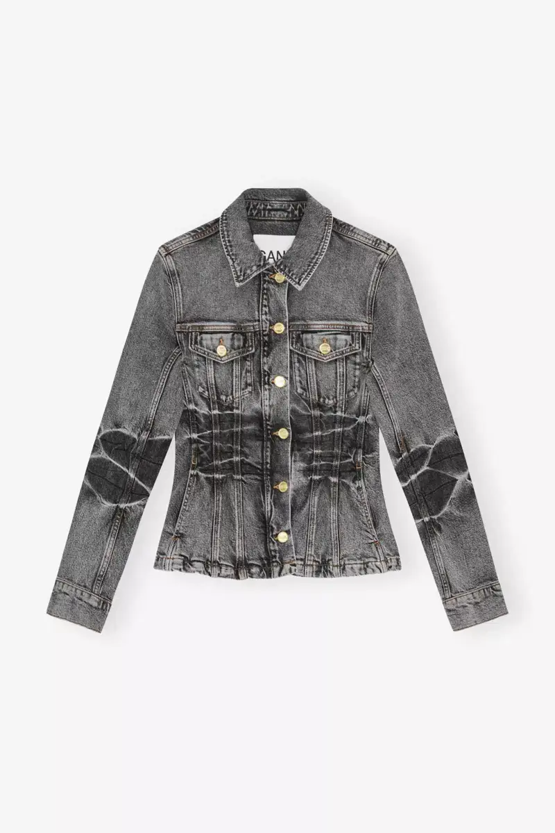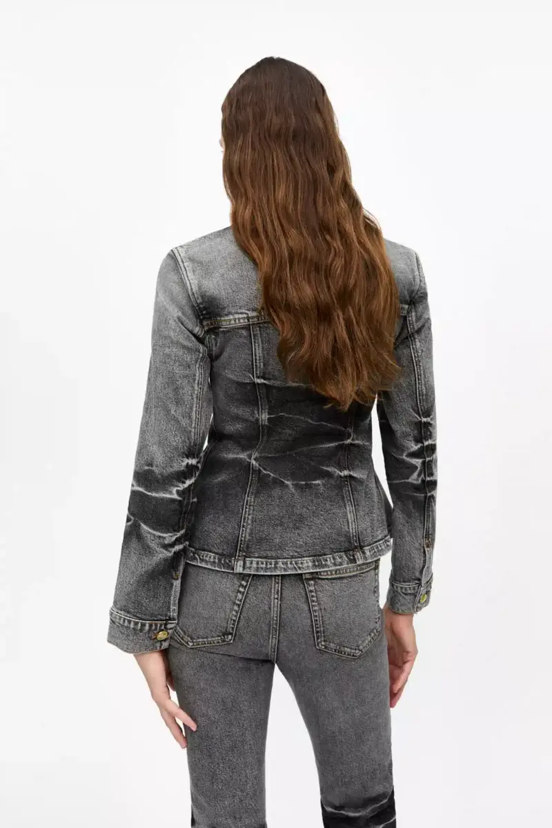 This jacket in black washed denim features a collar, button front closure, chest pockets and side pockets.
