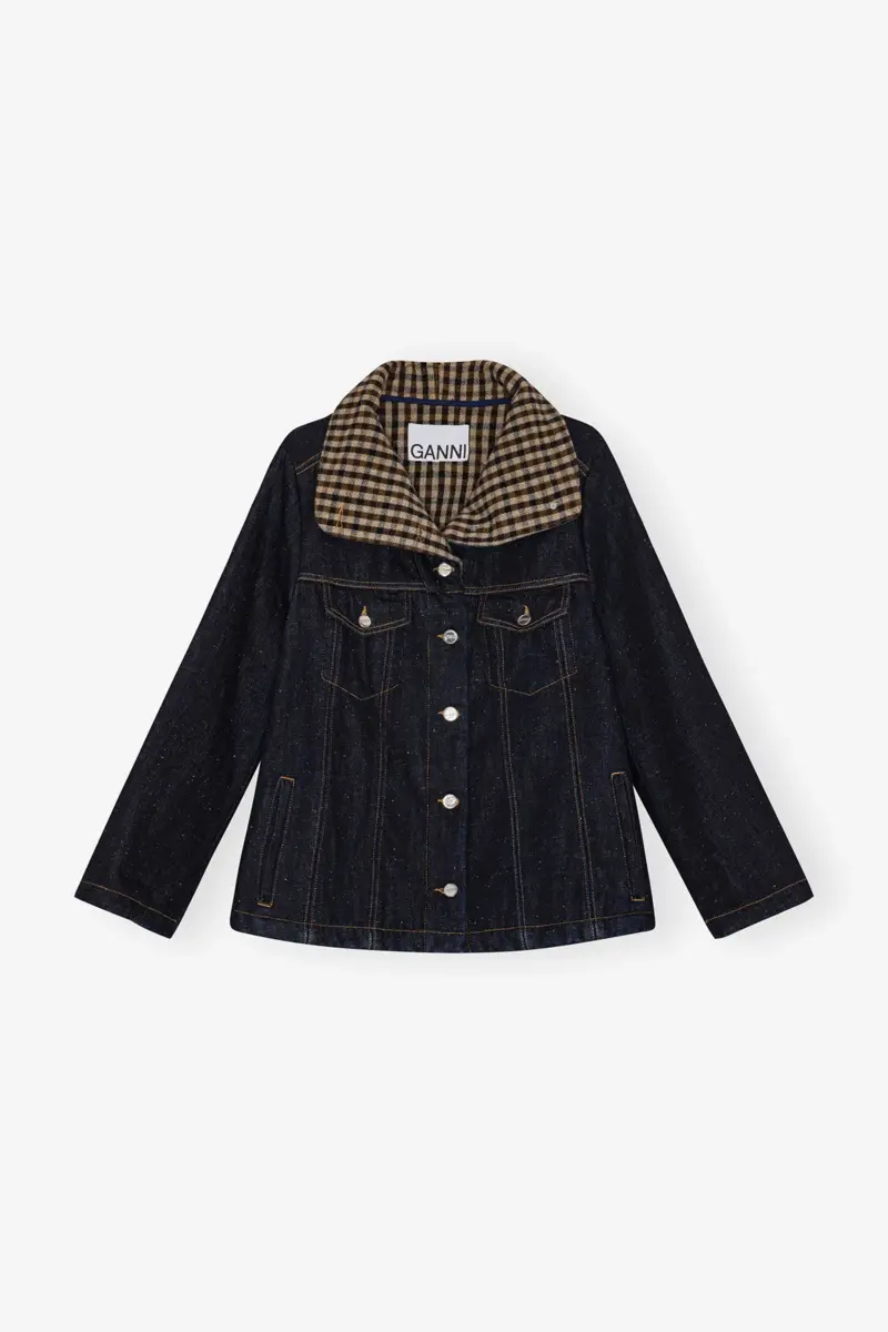 This jacket features a check print collar, button-front closure, 4 pockets and a GANNI logo patch on the back.