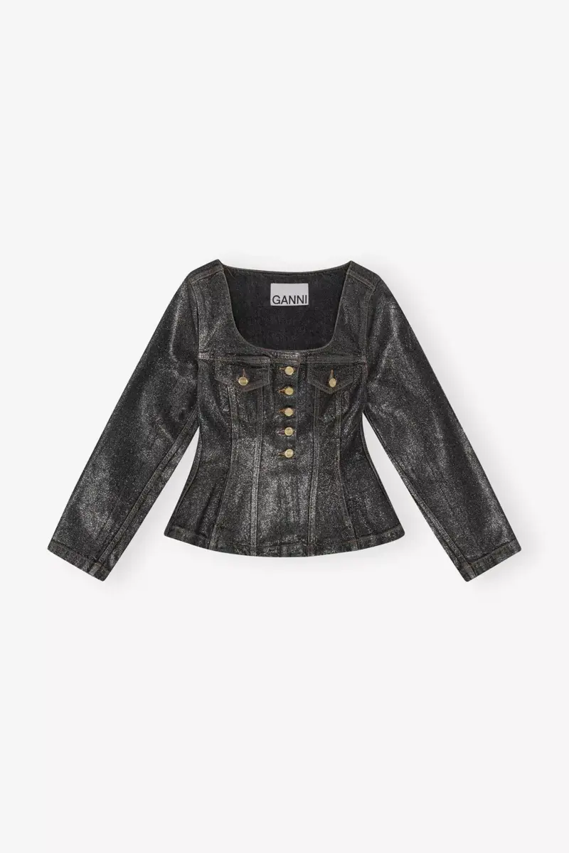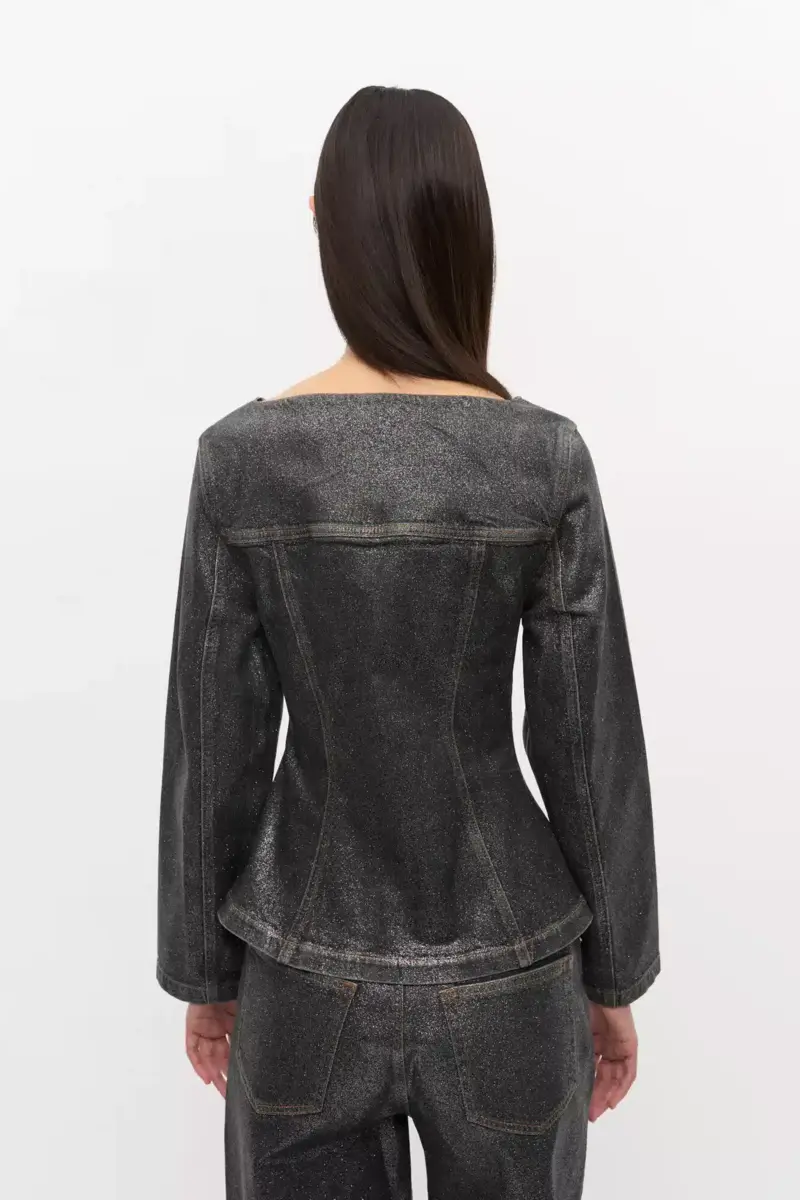 This denim blazer features a shimmery foil finish, a square neckline, button front closure and 2 chest pockets.