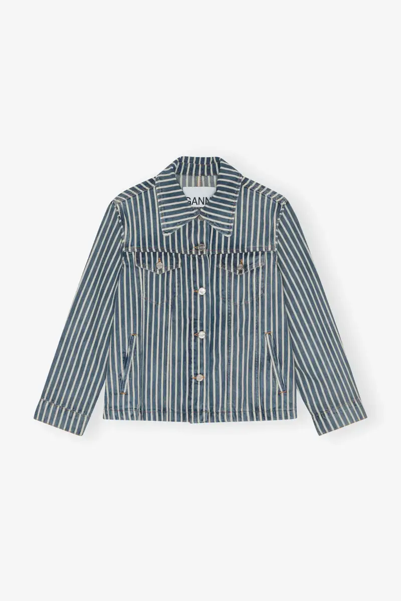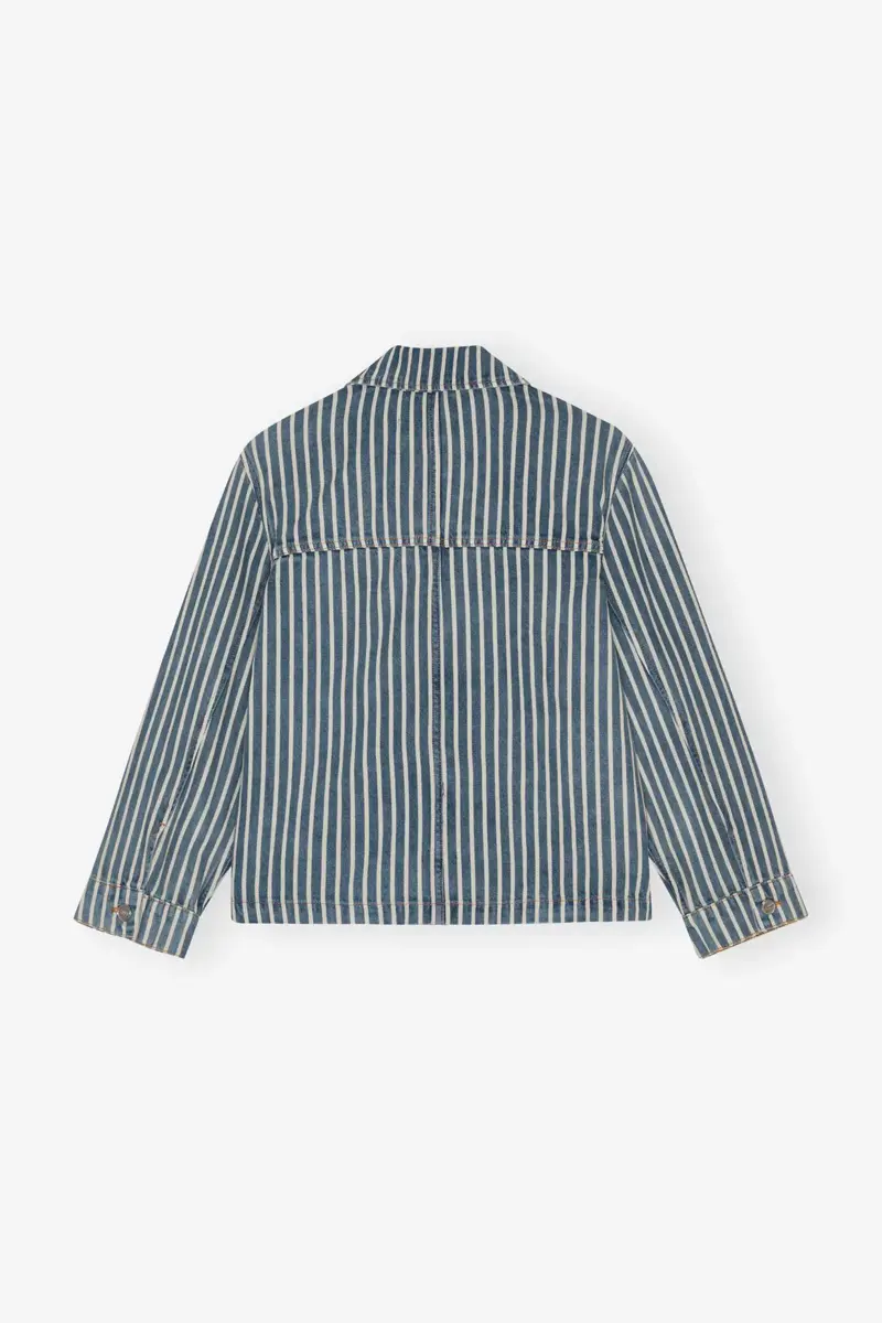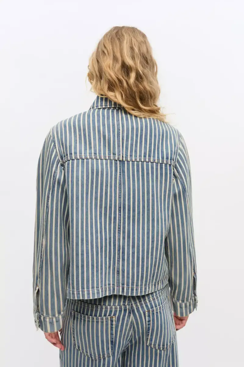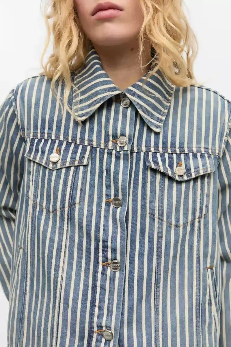 This jacket features a vertical stripe pattern, a classic collar, a button-down front and two chest pockets with button closures.