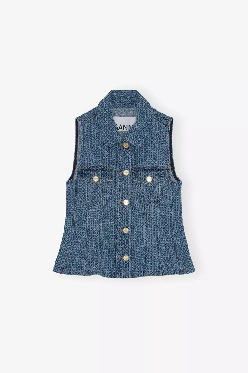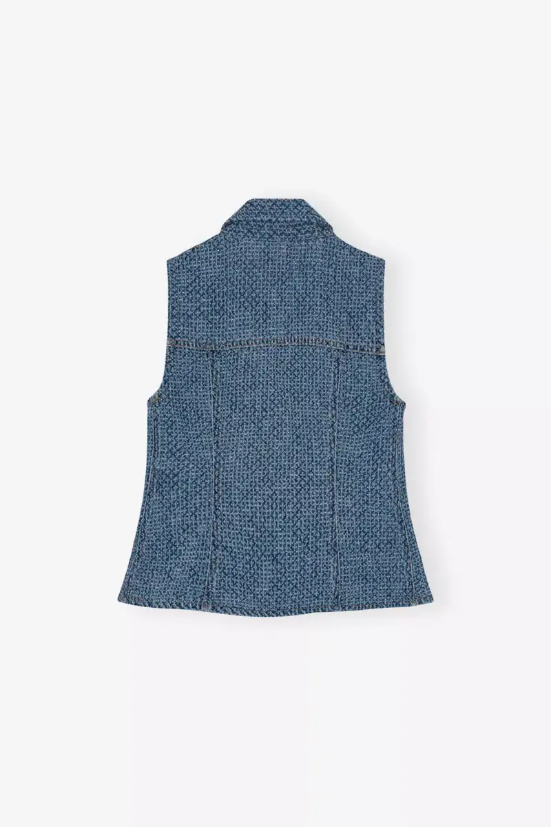 This vest in textured denim features a collar, button front closure and 2 chest pockets.