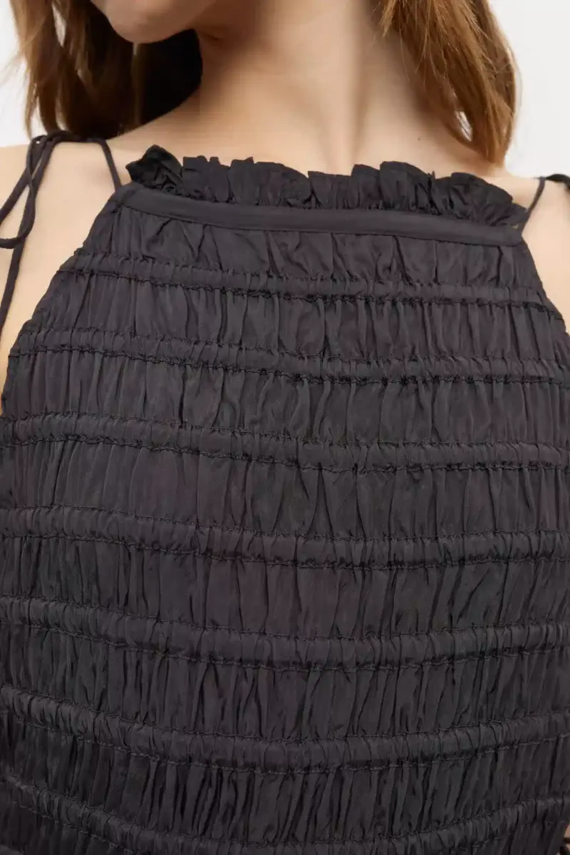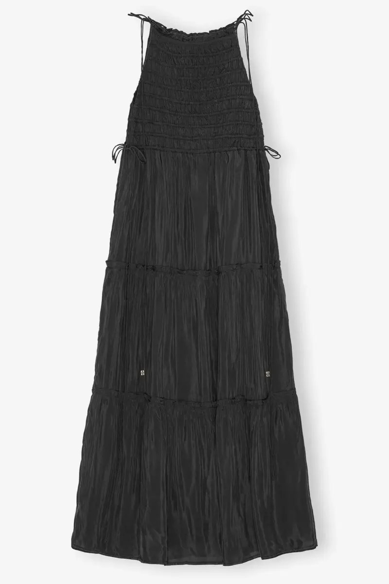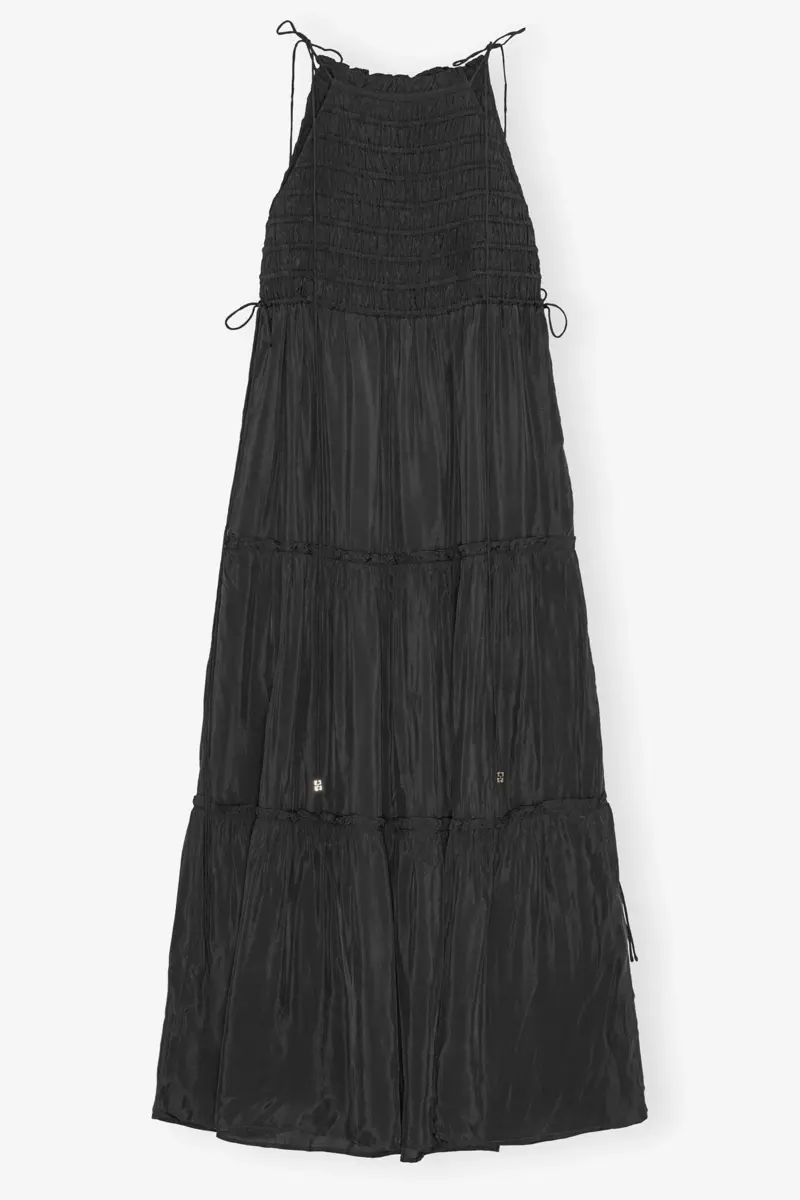 This dress features a smocked texture, tiered skirt design, adjustable straps and a silver-tone GANNI Butterfly logo tie-string finish.