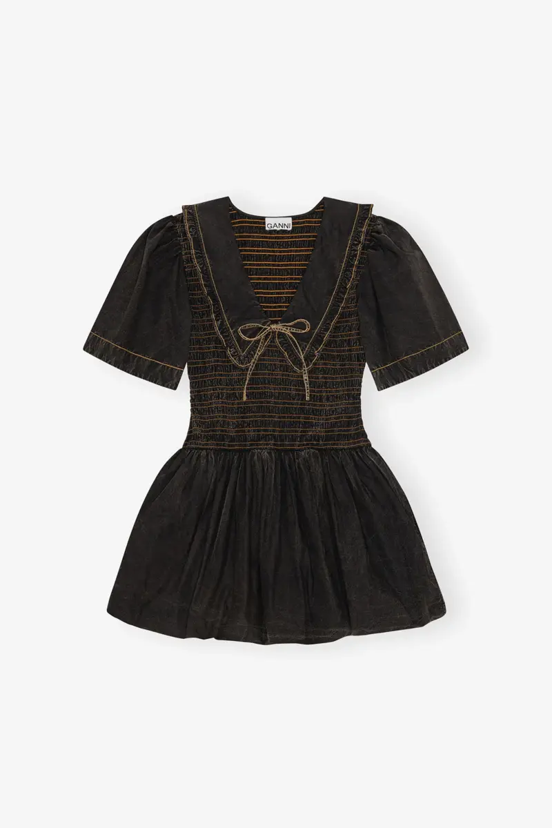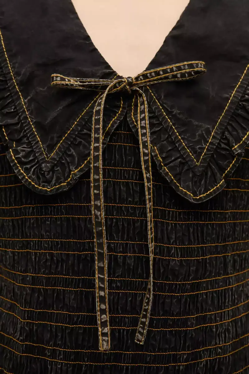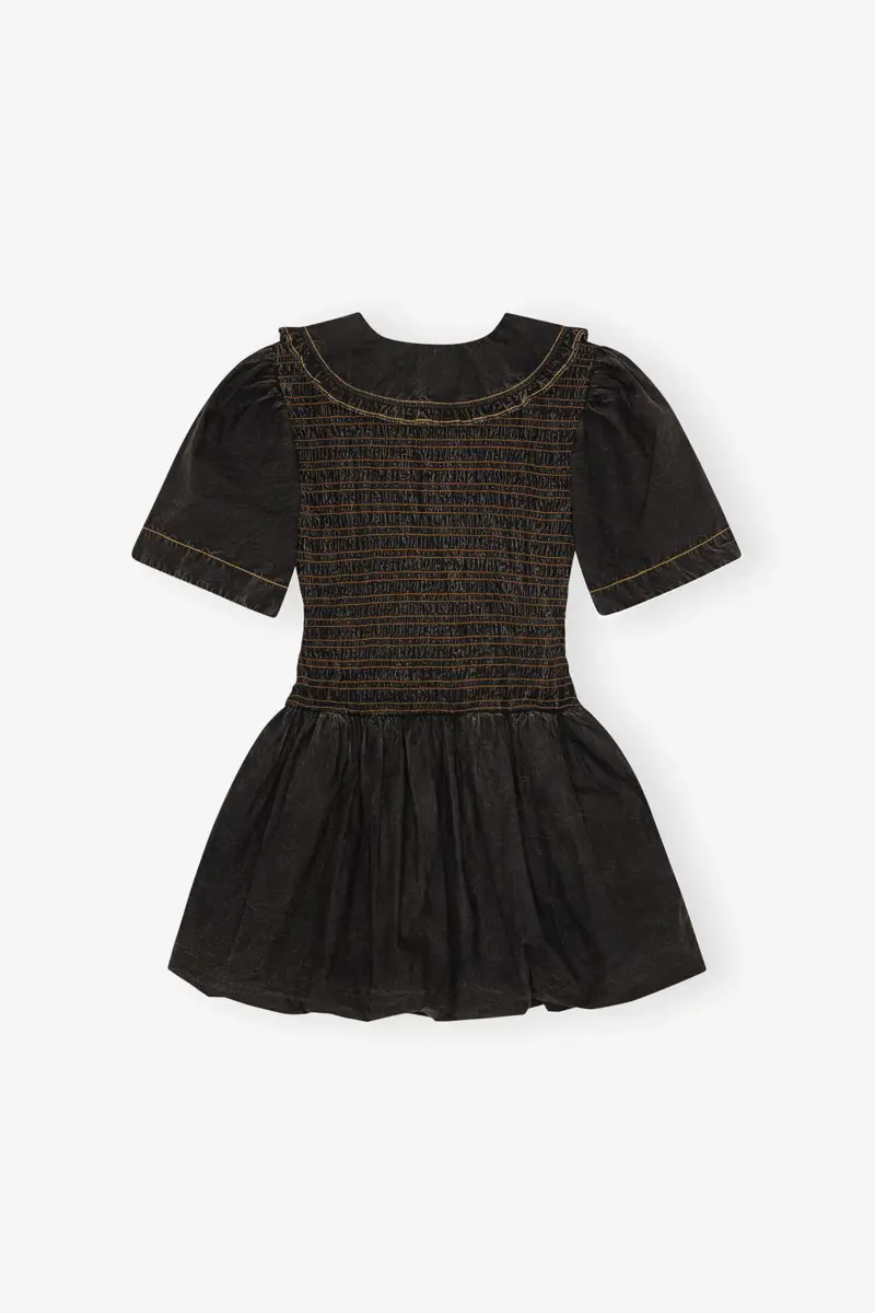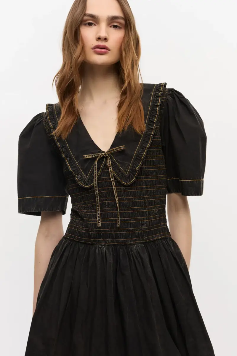 This dress features a smocked bodice, puff sleeves and a collar with a tie detail. The dress has a bubble skirt design.
