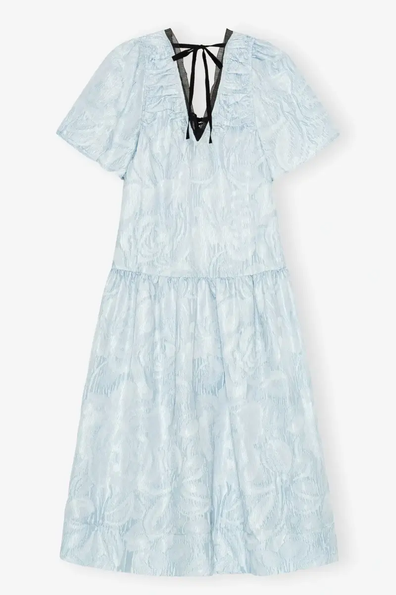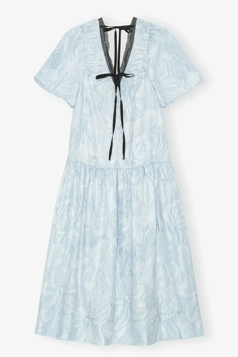 This Blue Textured Cloque Midi Dress features a v-neckline with a tie detail, short sleeves and a dropped waist.
