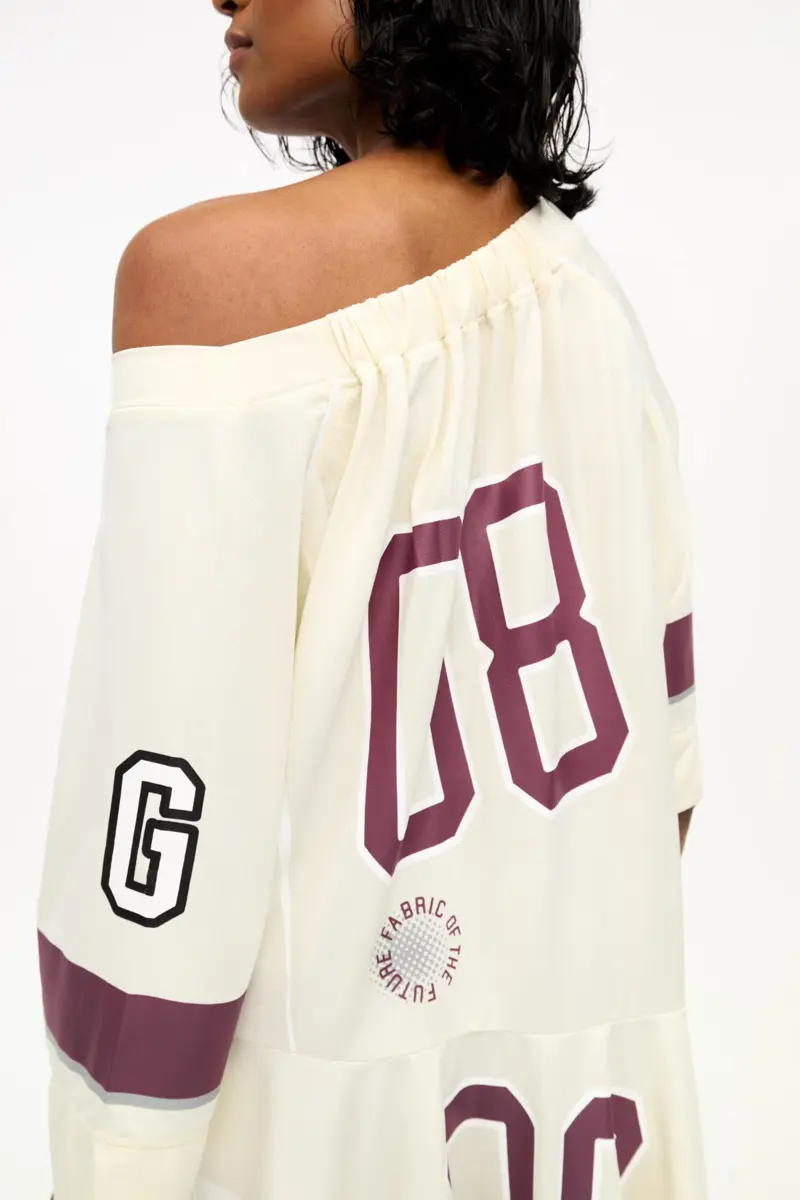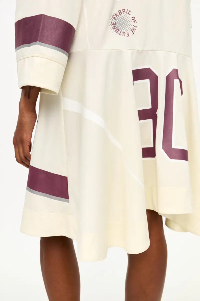 This dress features bold graphics and a relaxed silhouette. It is designed with a V-neckline, contrasting sleeve panels, and a bold ’08’ graphic adorning the back, skirt and sleeves.
