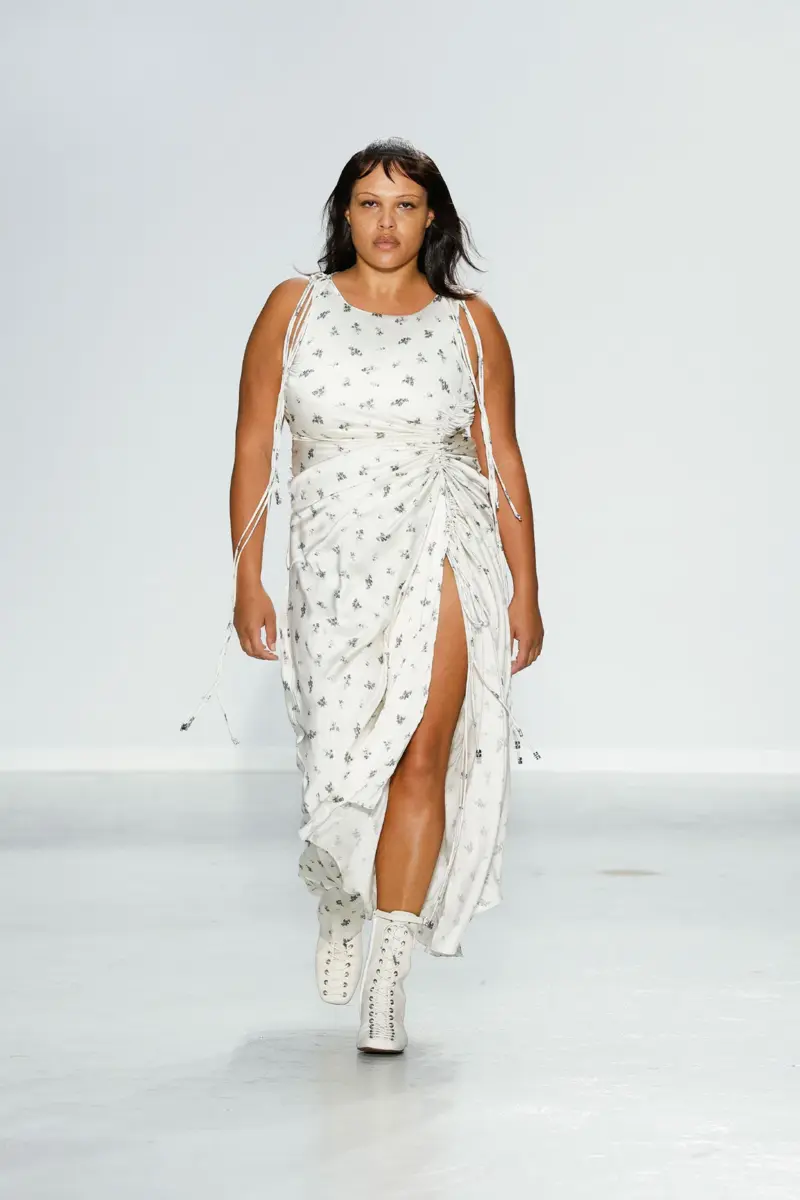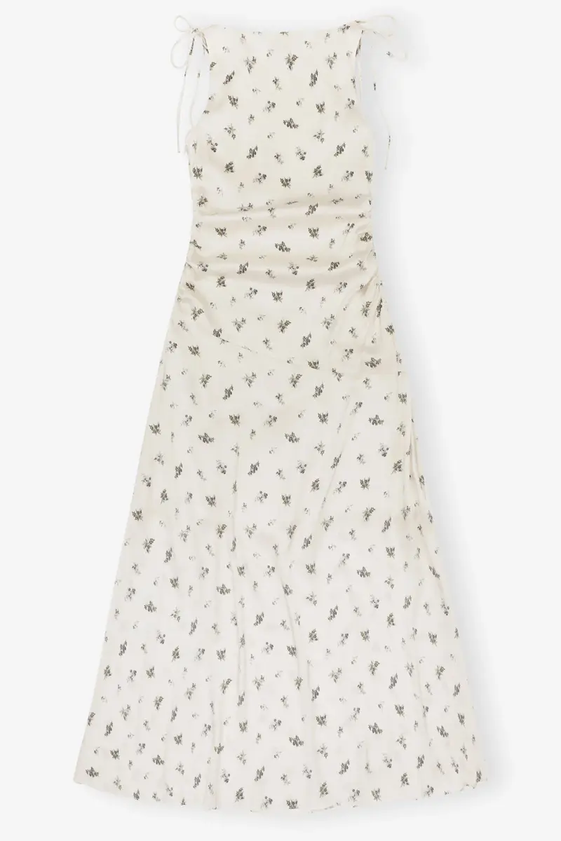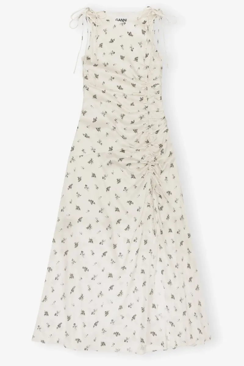 This White Satin Gathered Dress features a round neckline with tie details, ruching along the bodice and a high slit at the front.