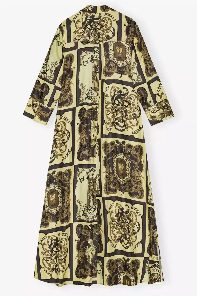 This dress features an ornate print. The dress is crafted from a silk satin fabric and has a button-down front and a matching belt.