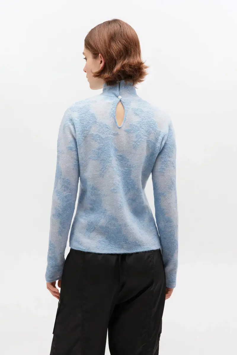 This turtleneck features a sheer flower print, high collar and long sleeves.