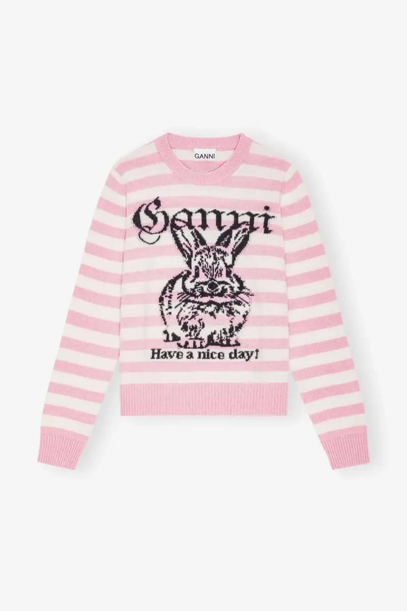 This jumper features a round neckline, long sleeves, ribbed edges, a graphic GANNI print and a GANNI logo.
