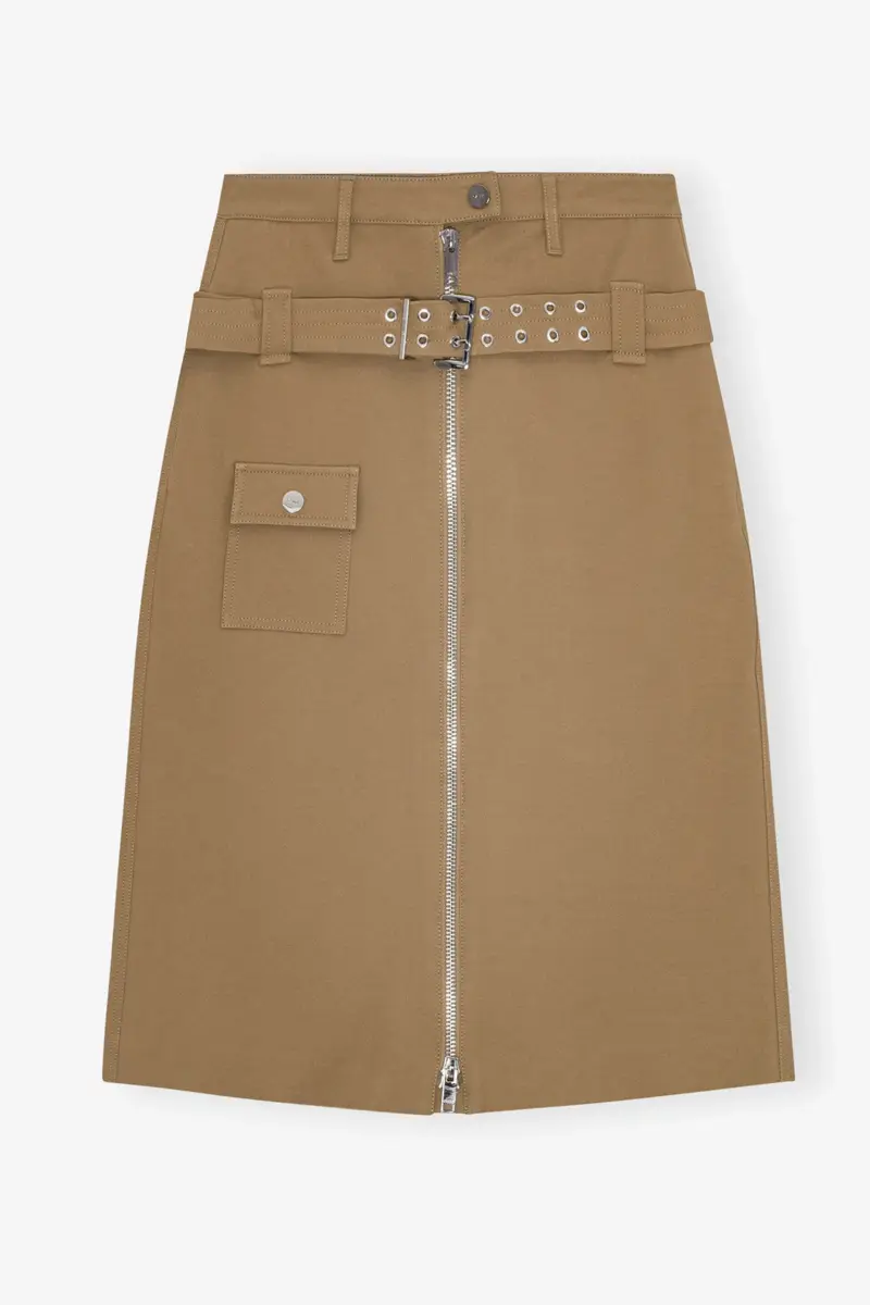 This skirt is made from heavy cotton tailoring, which provides a structured silhouette. The skirt features a button and front zipper closure, a matching belt with metallic eyelets and