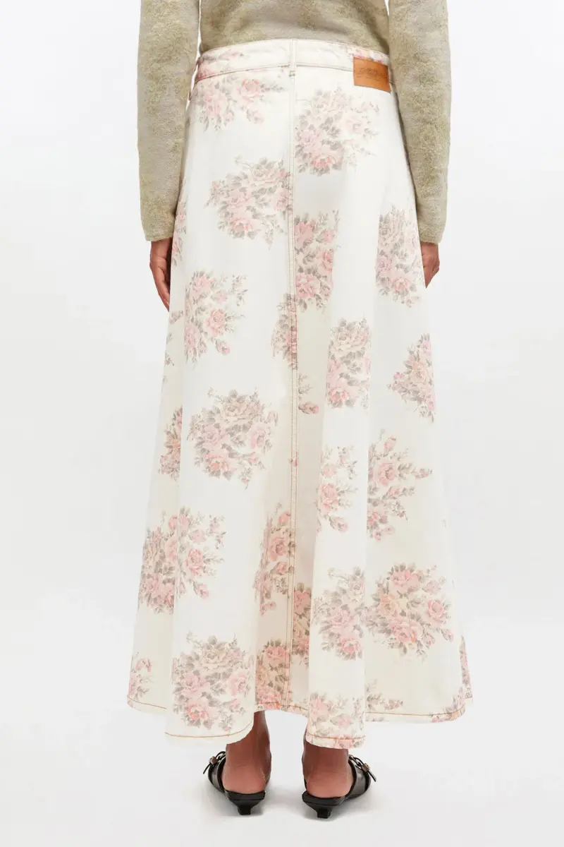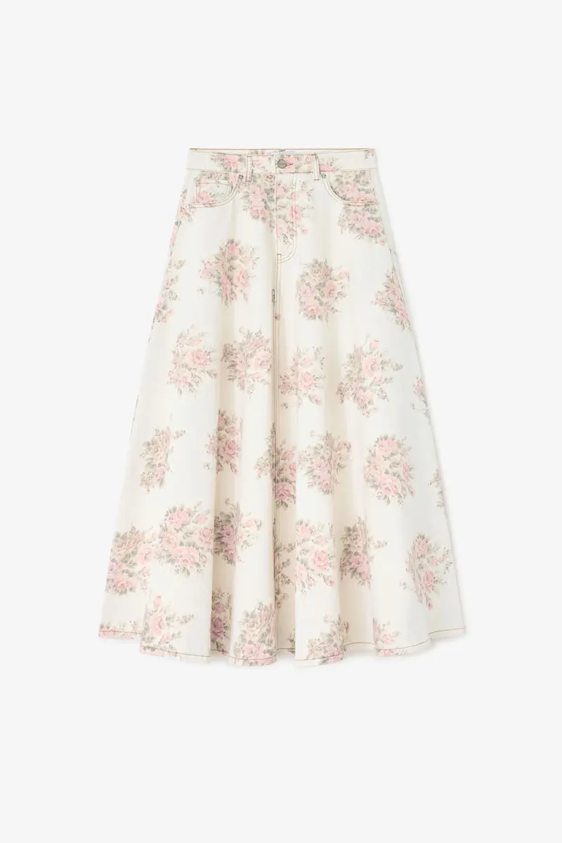 This skirt in floral printed denim feature a zip and button closure, 5 pockets, belt loops and a GANNI logo patch on back pocket.