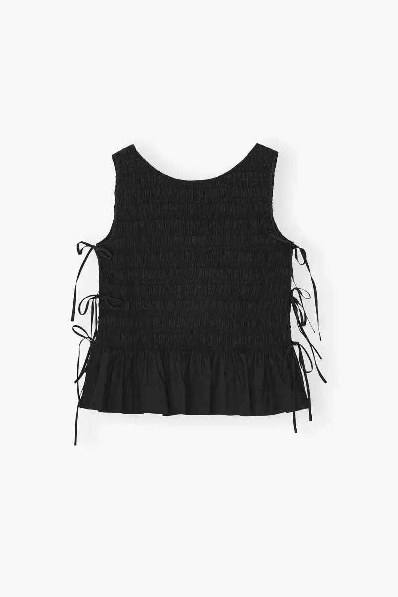 This top is sleeveless and features a smocked texture, tie details along the sides, a scoop back and a ruffled hem.