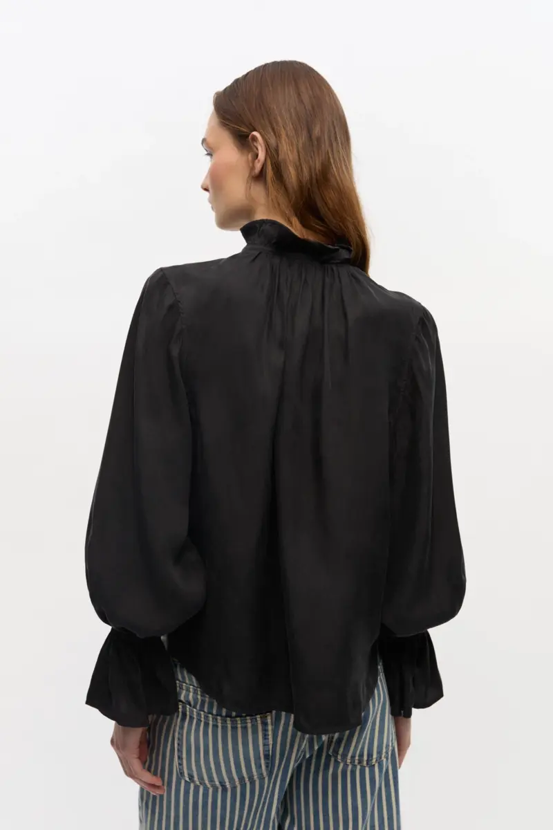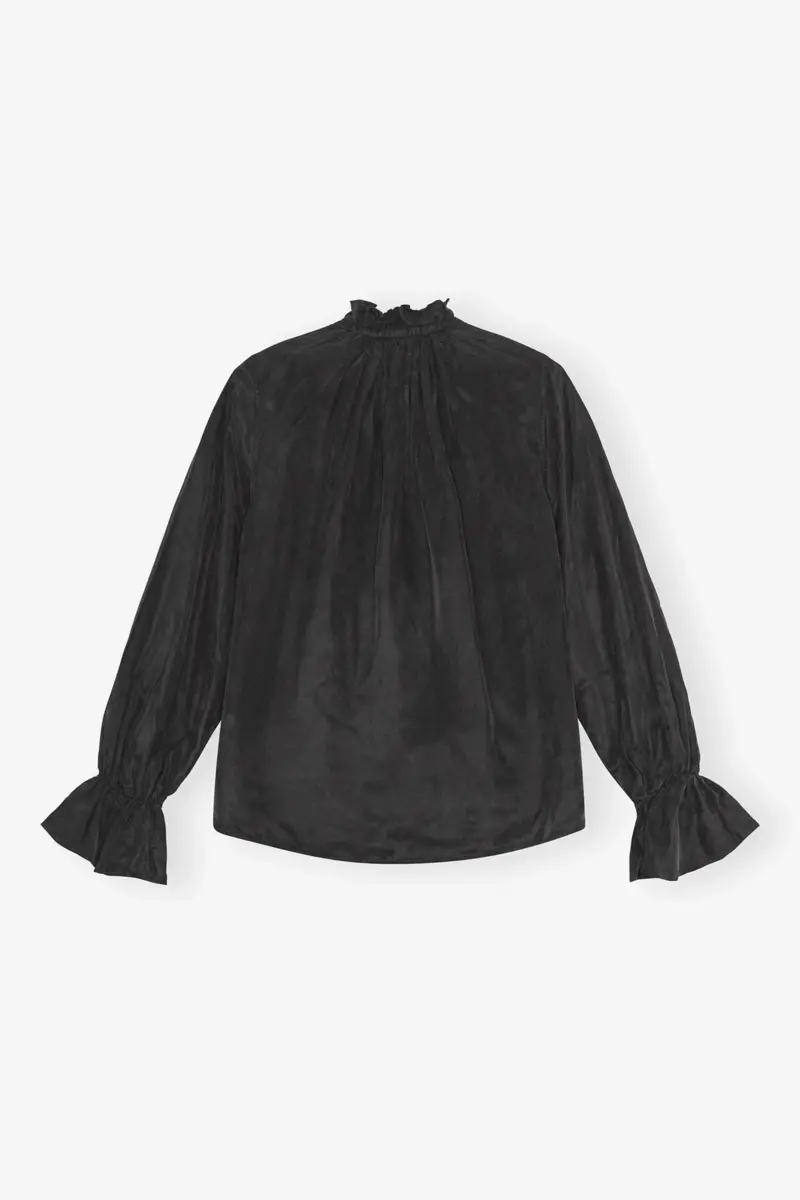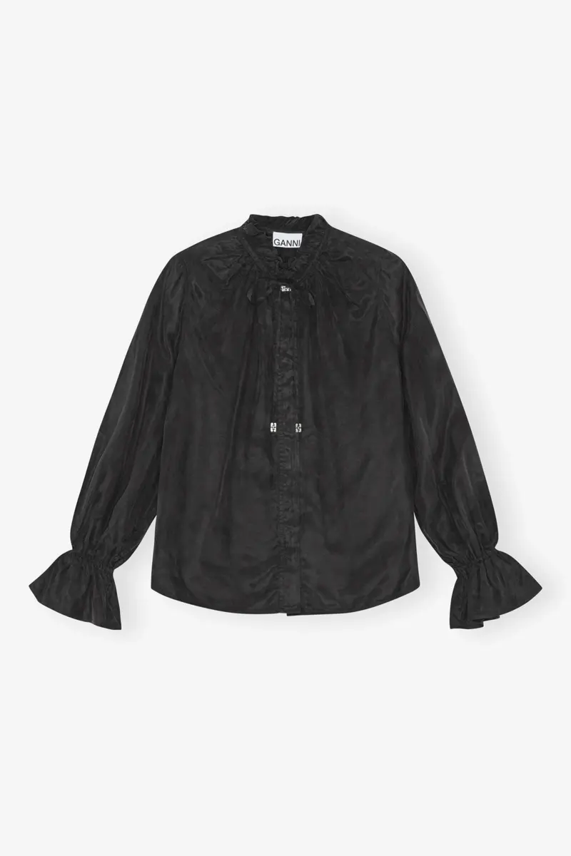 This shirt features a high neckline and a tie string design with silver-tone GANNI Butterfly logo details. The shirt has voluminous sleeves and cuff details.