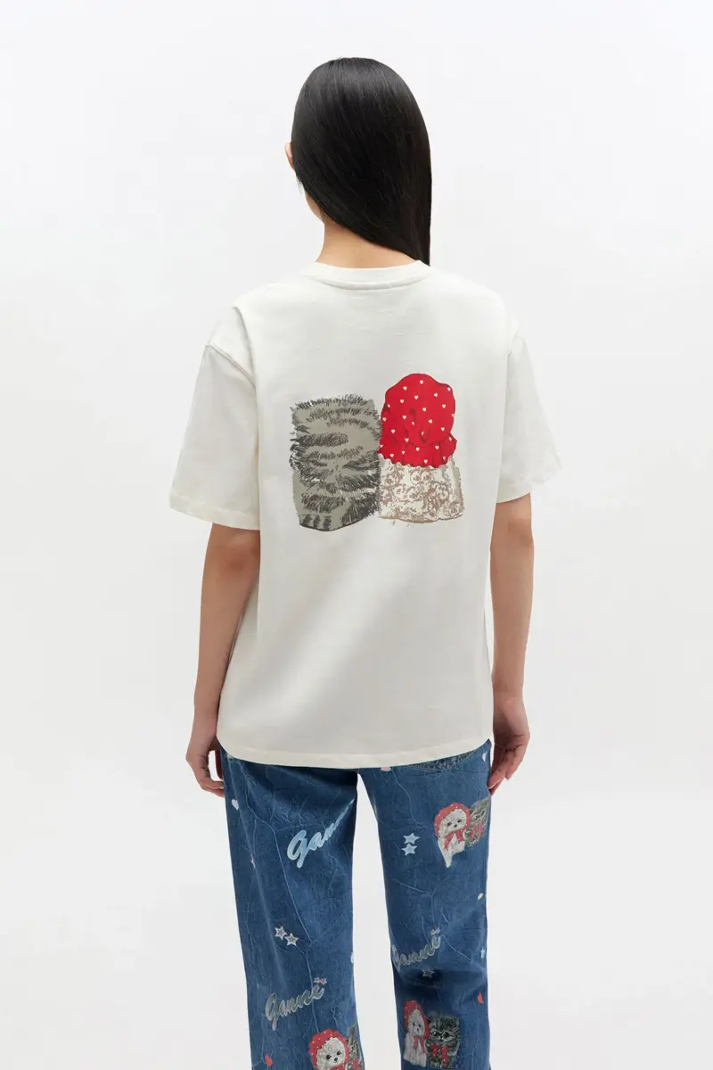 This T-shirt features a round neckline, short sleeves and a GANNI logo. The T-shirt has a animal print graphic on the front and back.