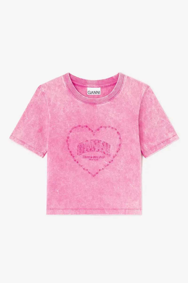 This T-shirt features a round neckline, short sleeves, and a GANNI logo. The T-shirt has an embroidered heart and a ‘Have a nice day! Please recycle’ message.