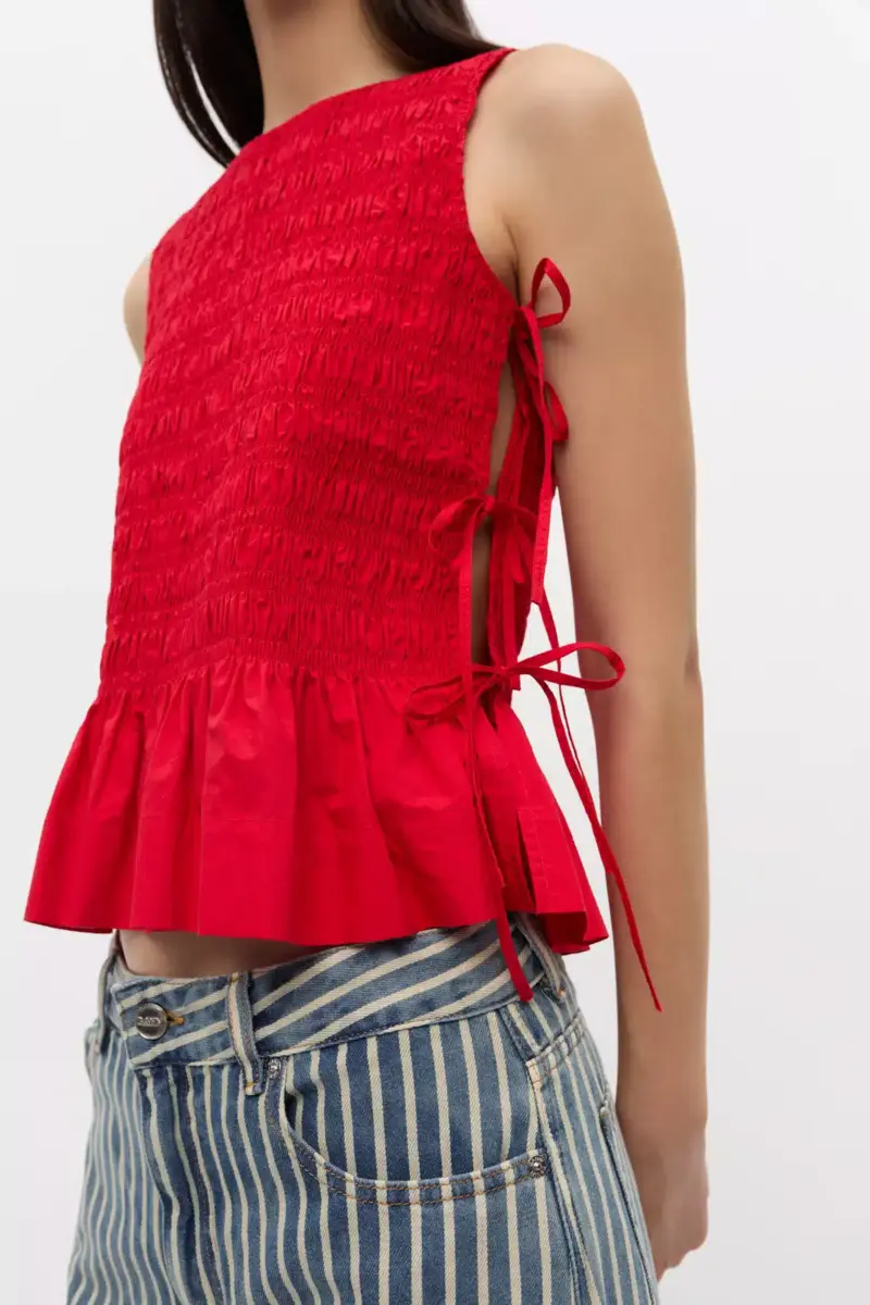 This top is sleeveless and features a smocked texture, tie details along the sides, a scoop back and a ruffled hem.