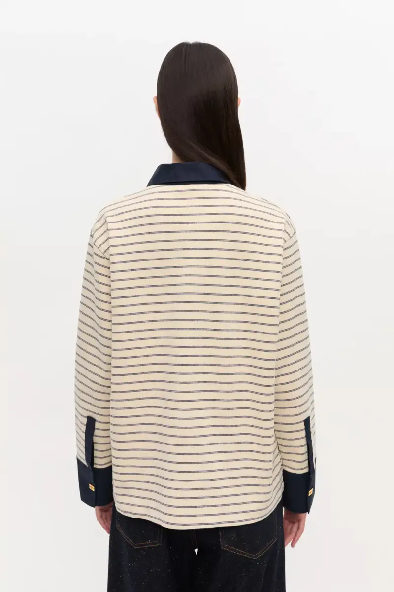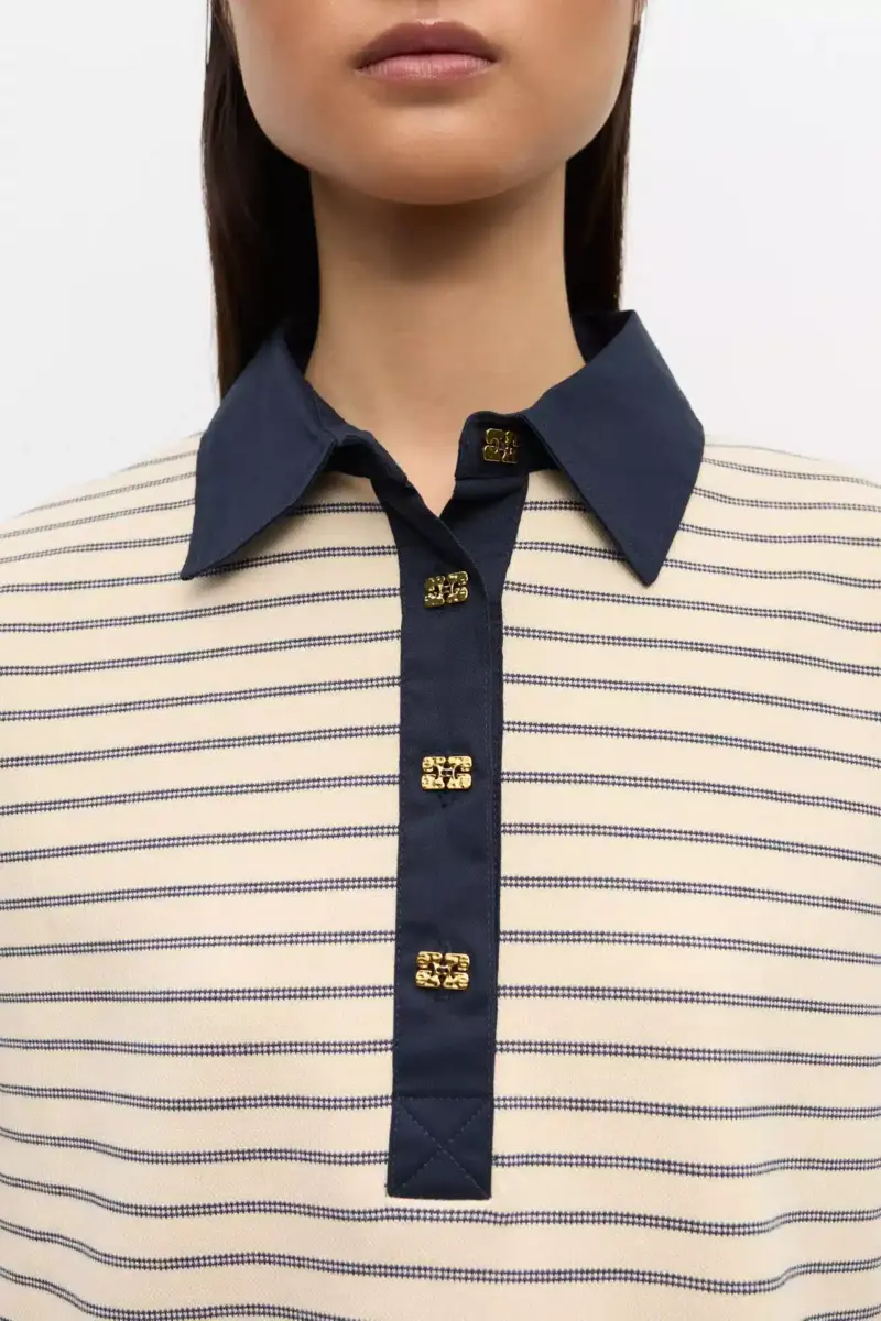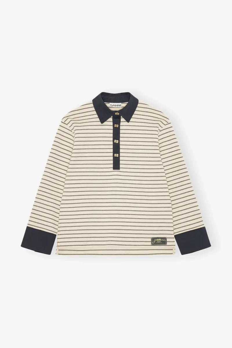 This polo features stripped pattern, a contrasting collar, gold-tone GANNI Butterfly buttons and a GANNI logo patch at them hem.