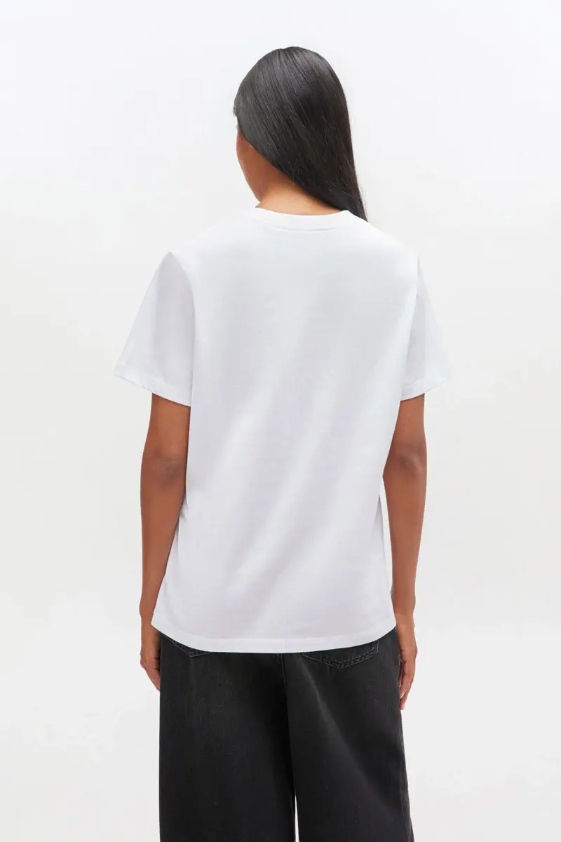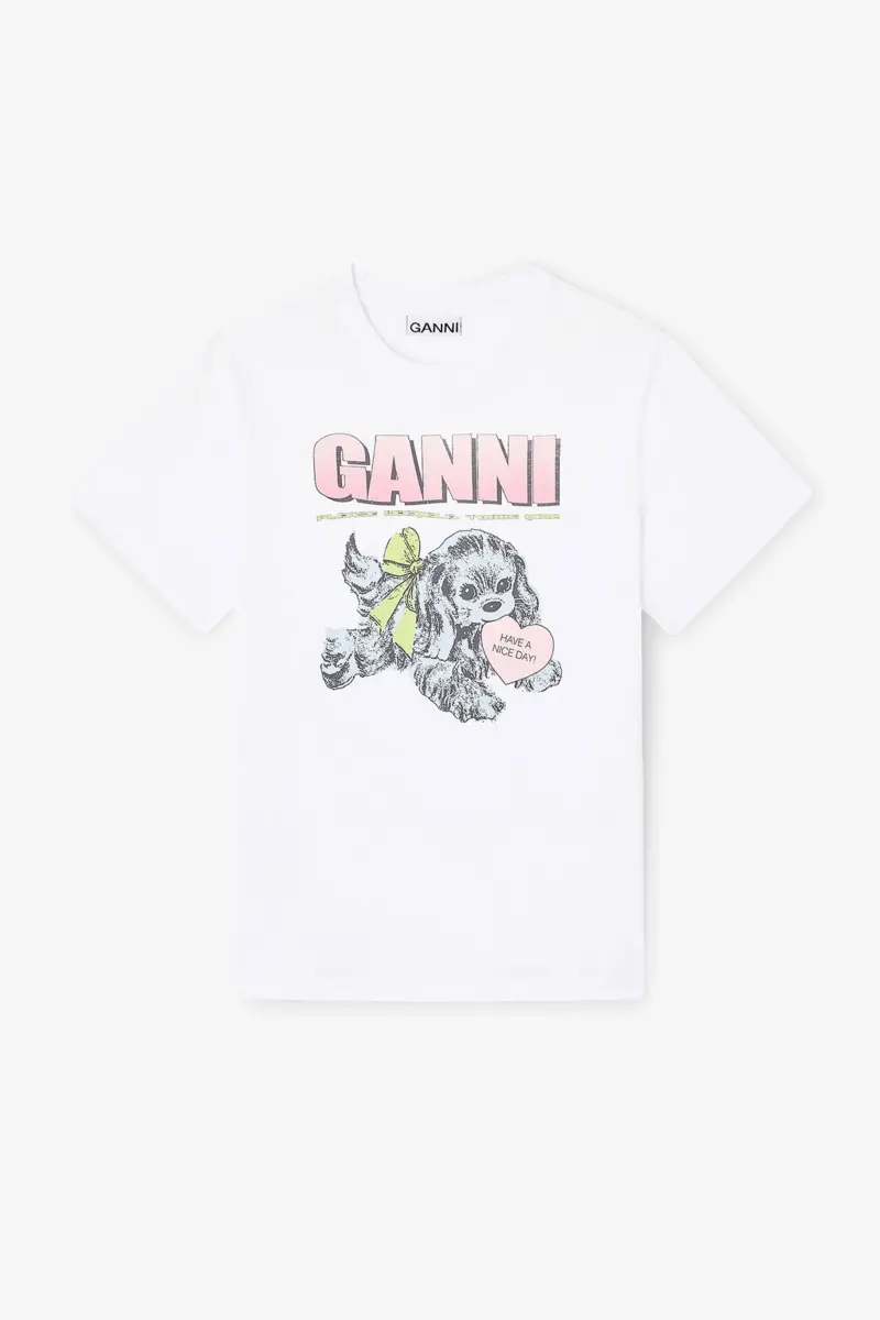 This T-shirt features a round neckline, short sleeves, and a GANNI logo. The T-shirt has a puppy print graphic and a ‘Have a nice day! Please recycle’ message.