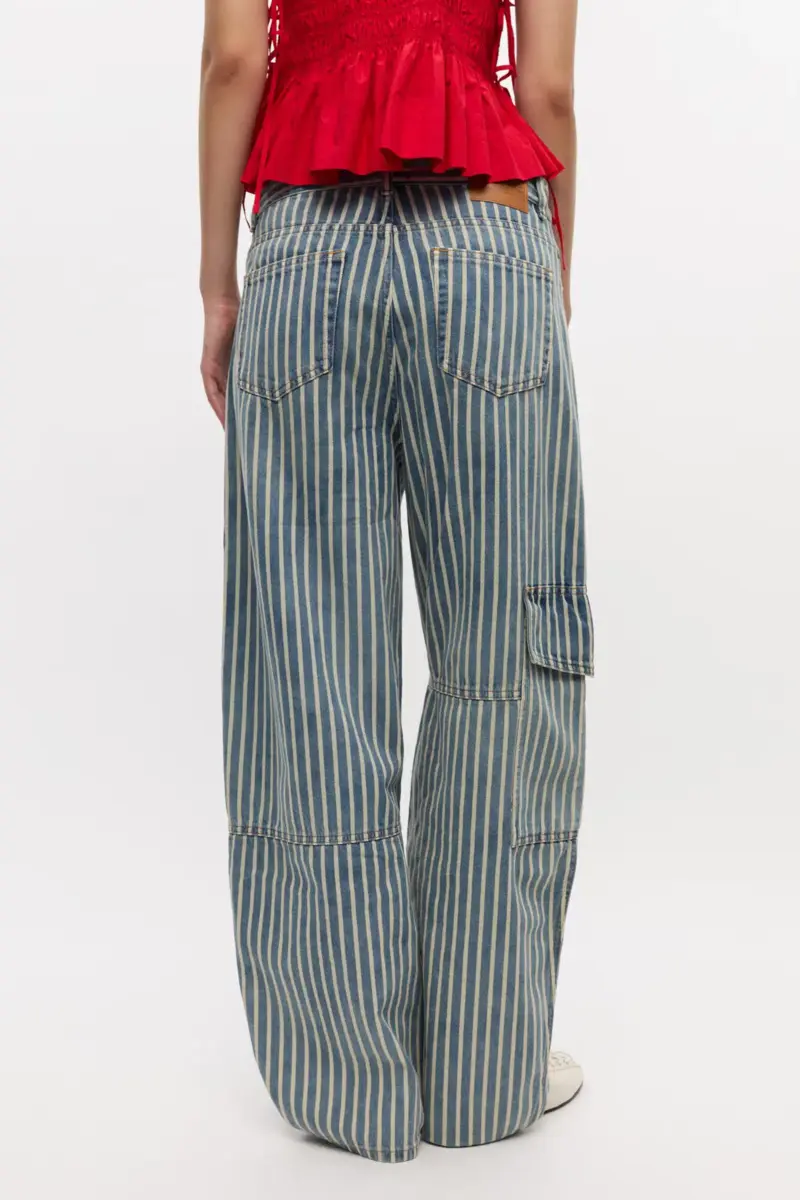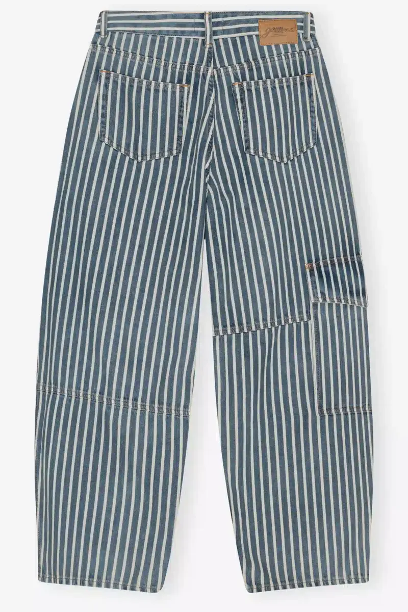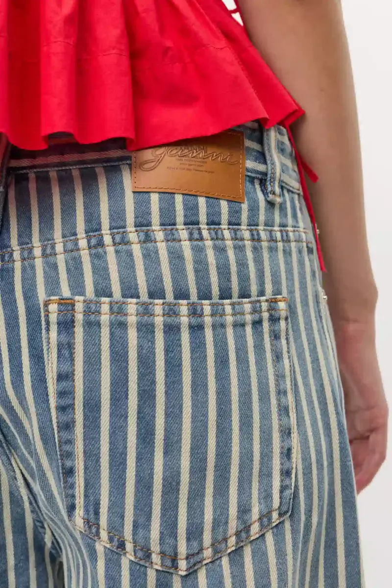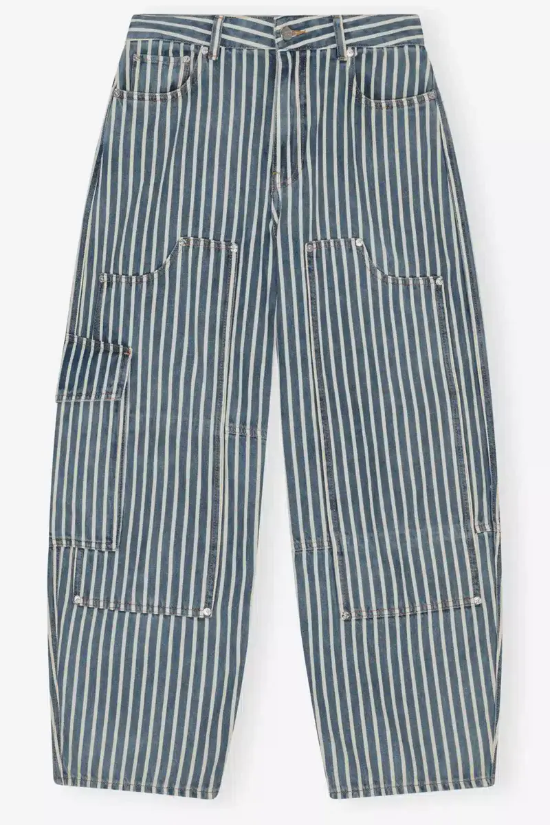 These jeans feature a blue and white striped pattern. The jeans have belt loops, multiple pockets and zip and button closure.