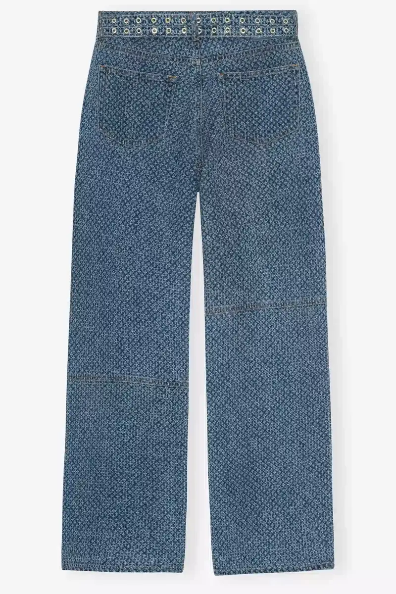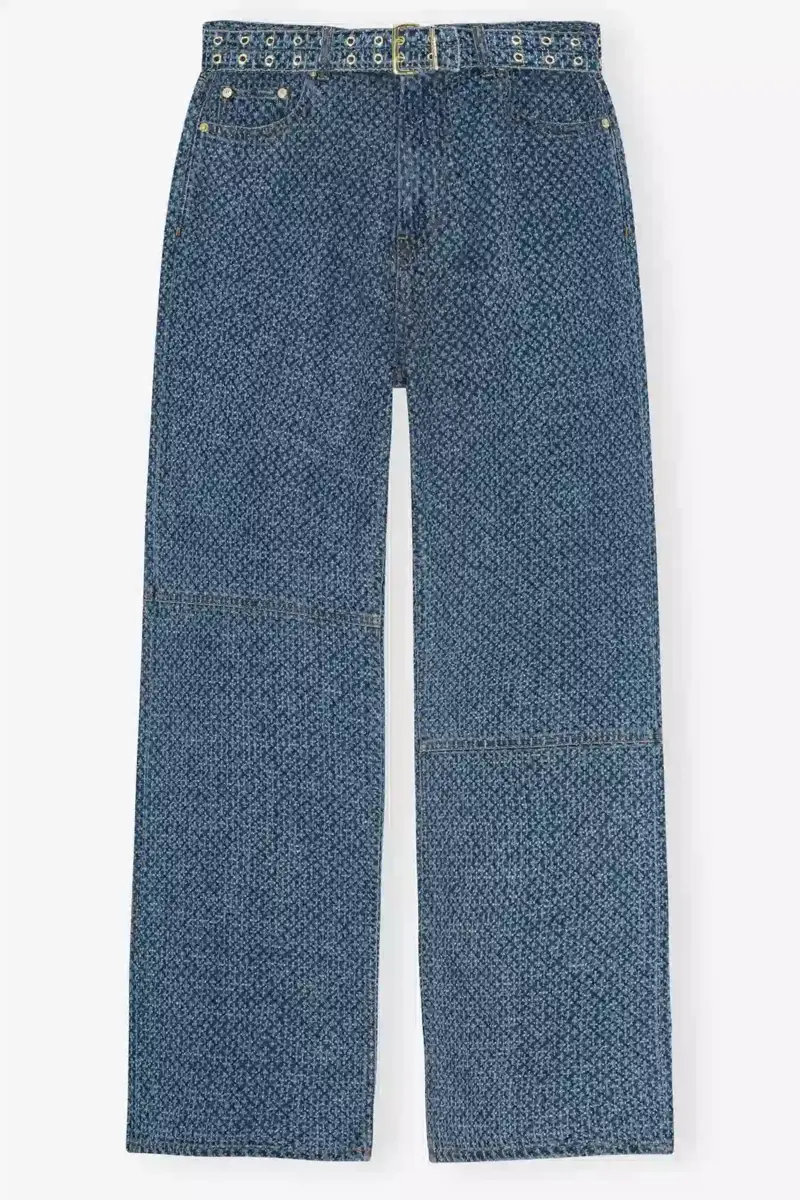 These jeans in textured denim feature a zip and button closure, 5 pockets, belt loops, GANNI logo patch on back pocket and belt detail.