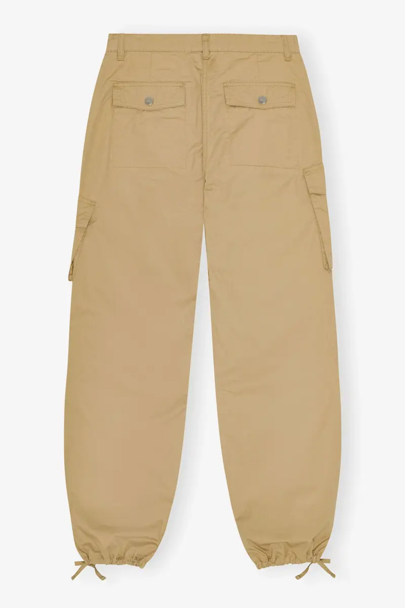 These trousers feature belt loops, a zip and button closure, a small front pocket, two side cargo pockets, back pockets and drawstring at the ankles.