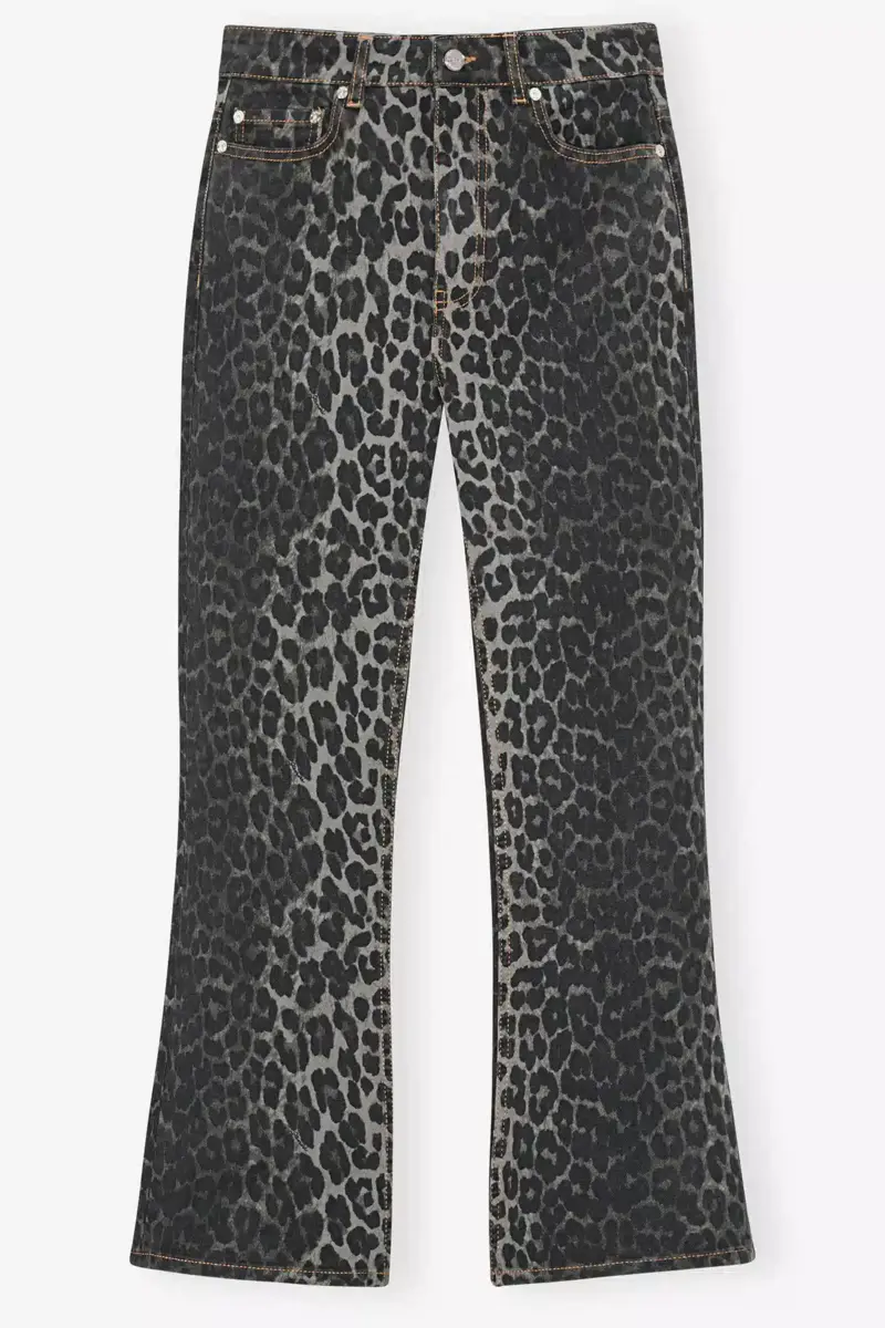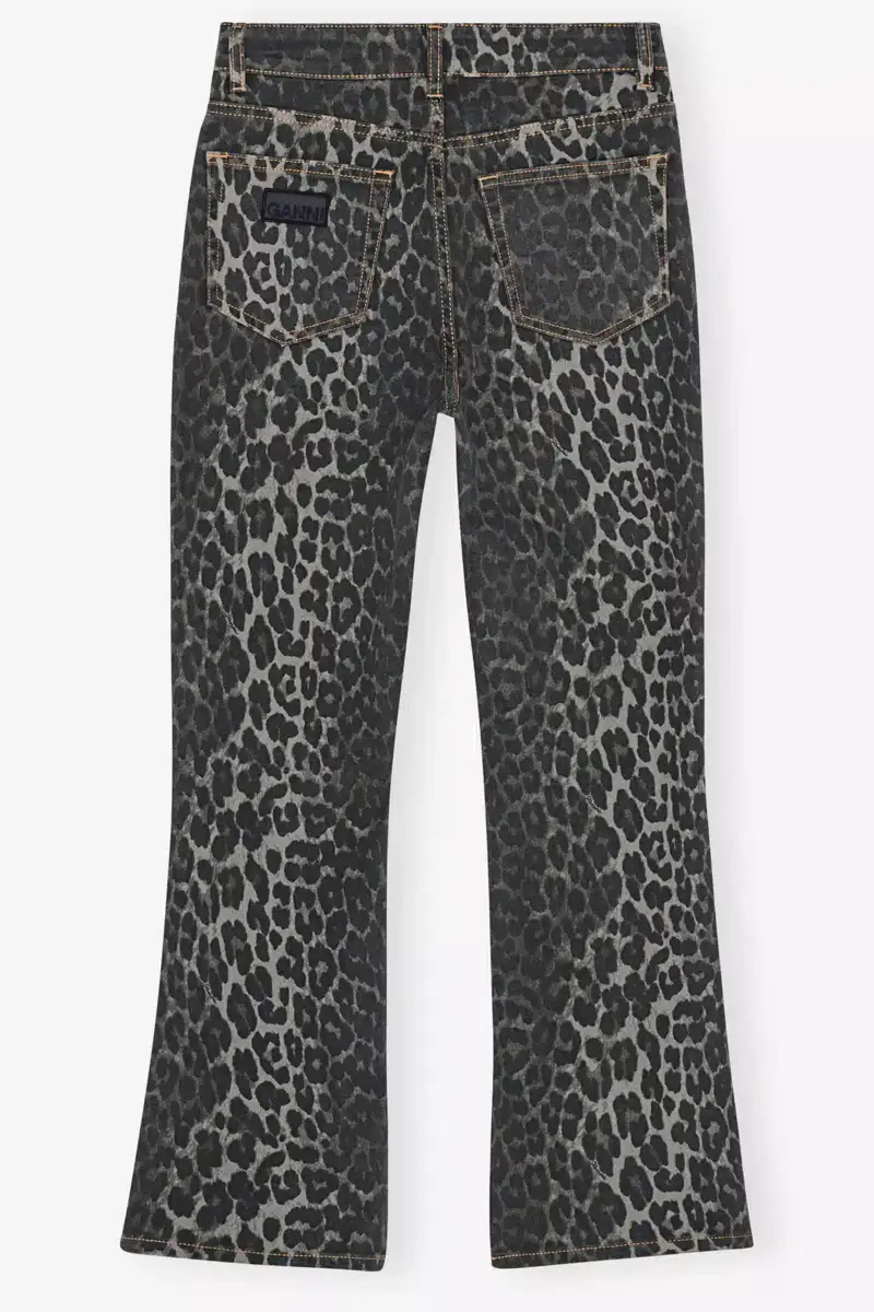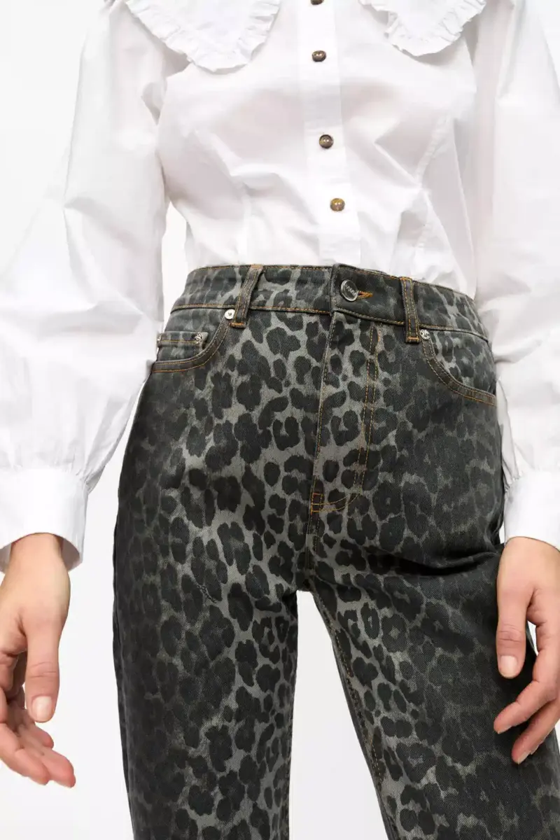 These jeans in grey leopard printed denim feature a zip and button closure, 5 pockets, belt loops and a GANNI logo at the back pocket.