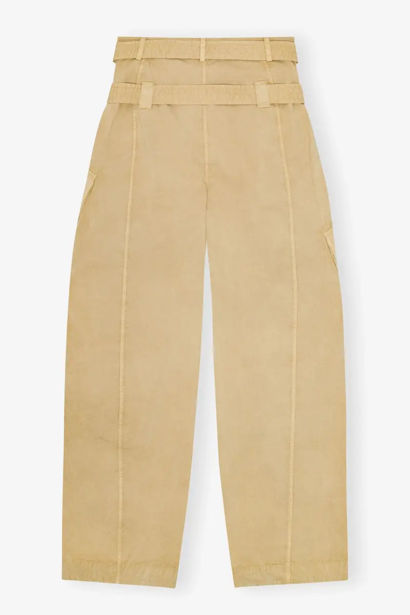 These trousers feature a zip and button closure, matching belts and front pockets.