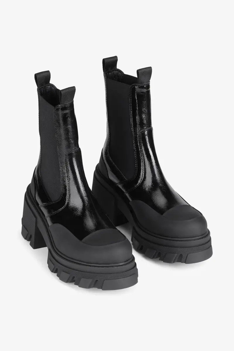 These boots feature elastic panels, toe cap details, pull tabs, chunky cleated soles and a subtle GANNI logo.
